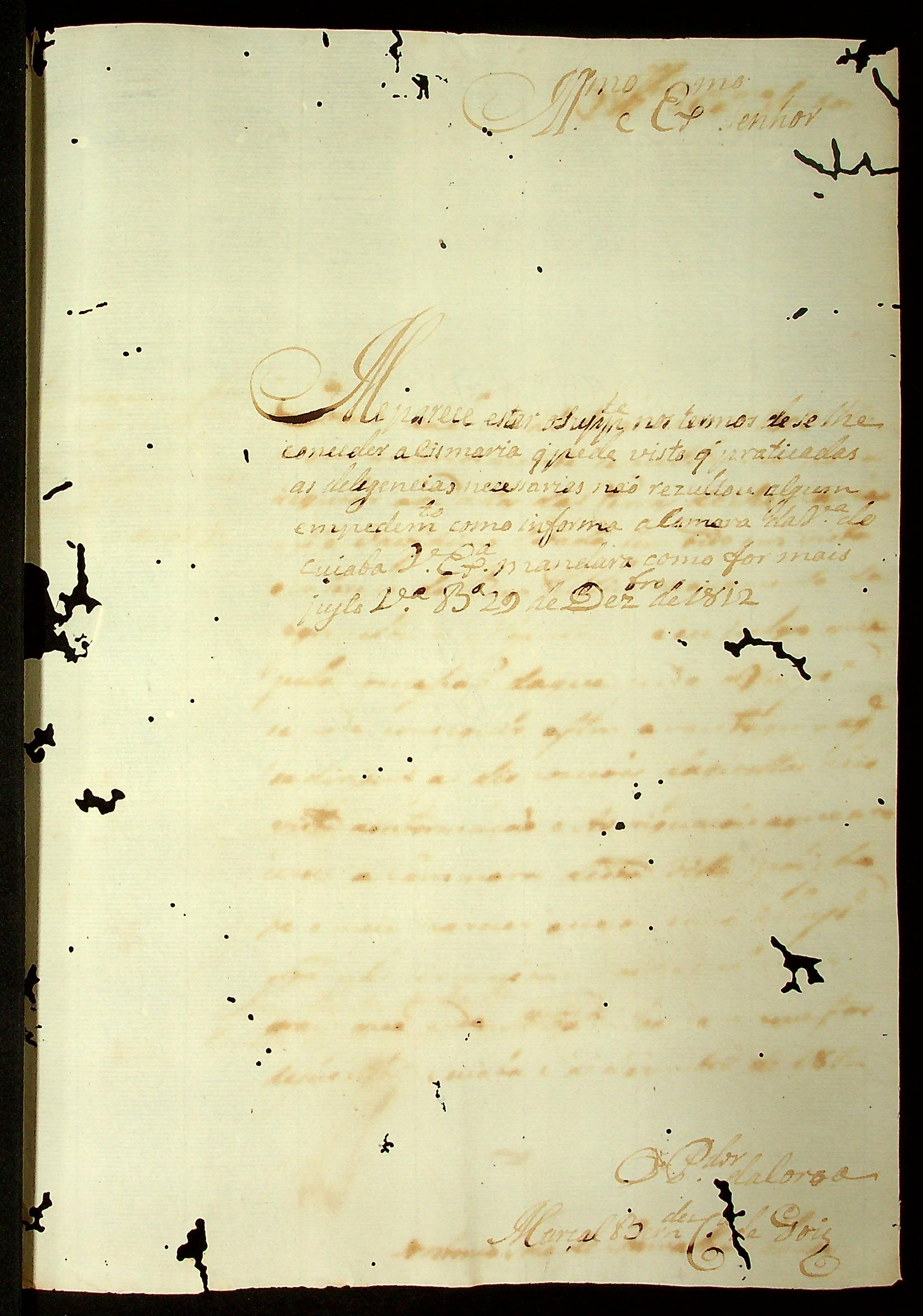 REQUERIMENTO de Bento Manoel Domingues ao Governador e Capitão-General da Capitania de Mato Grosso João Carlos Augusto D' Oeynhausen e Gravemberg.