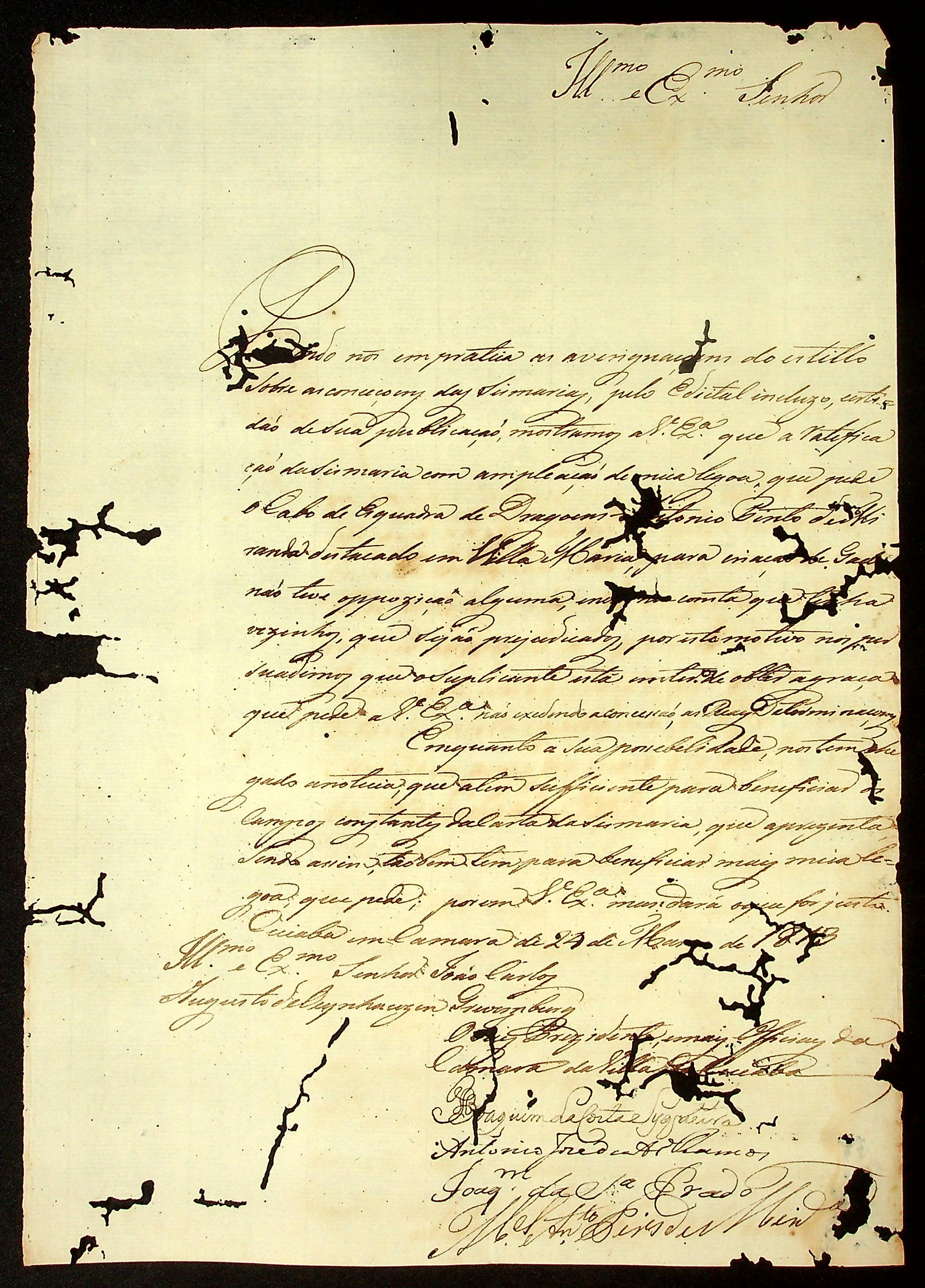 REQUERIMENTO do Cabo Antônio Pinto de Miranda ao Governador e Capitão-General da Capitania de Mato Grosso João Carlos Augusto D' Oeynhausen e Gravemberg.
