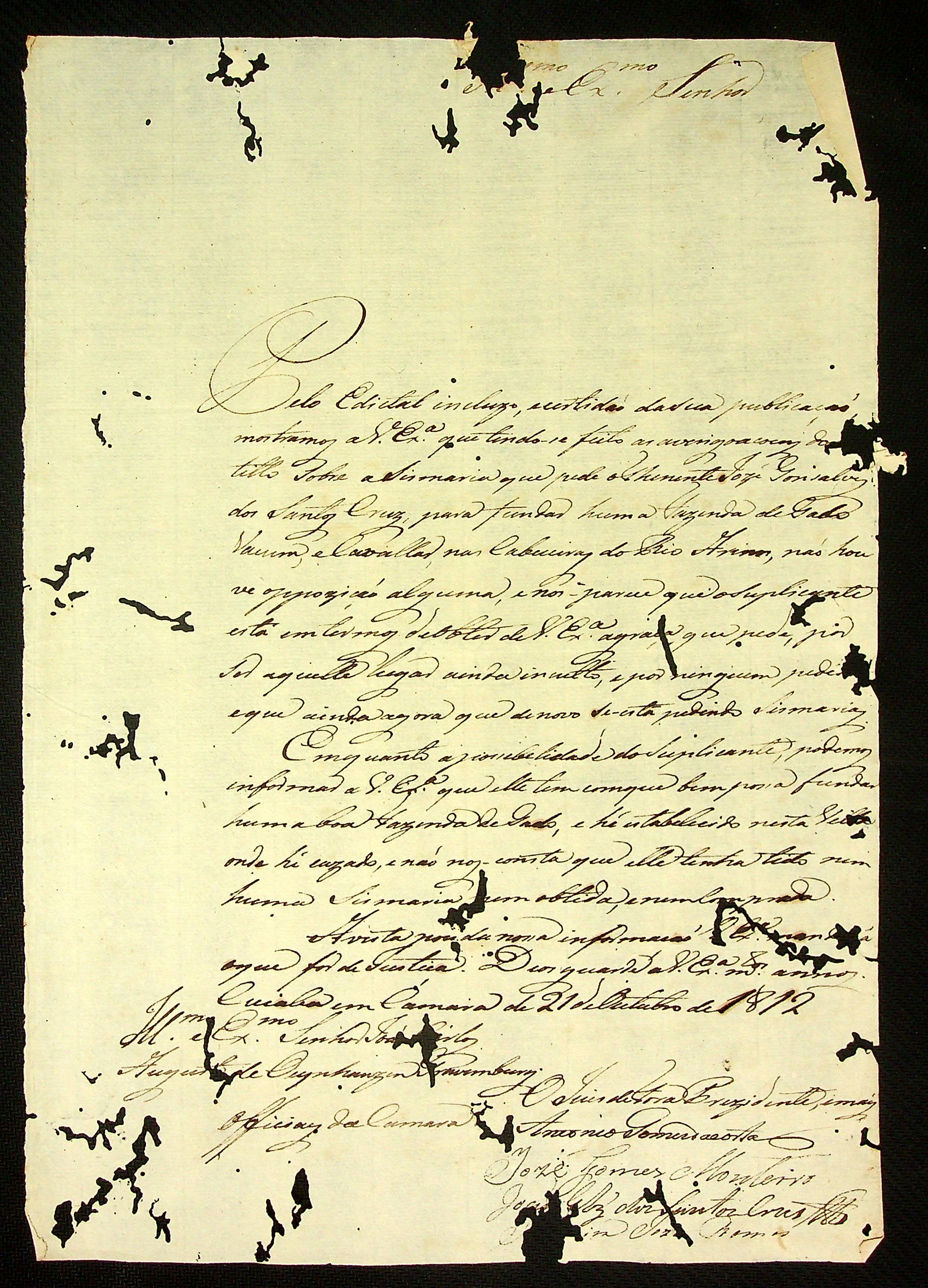REQUERIMENTO do Tenente José Gonçalves dos Santos Cruz ao Governador e Capitão-General da Capitania de Mato Grosso João Carlos Augusto D' Oeynhausen e Gravemberg.
