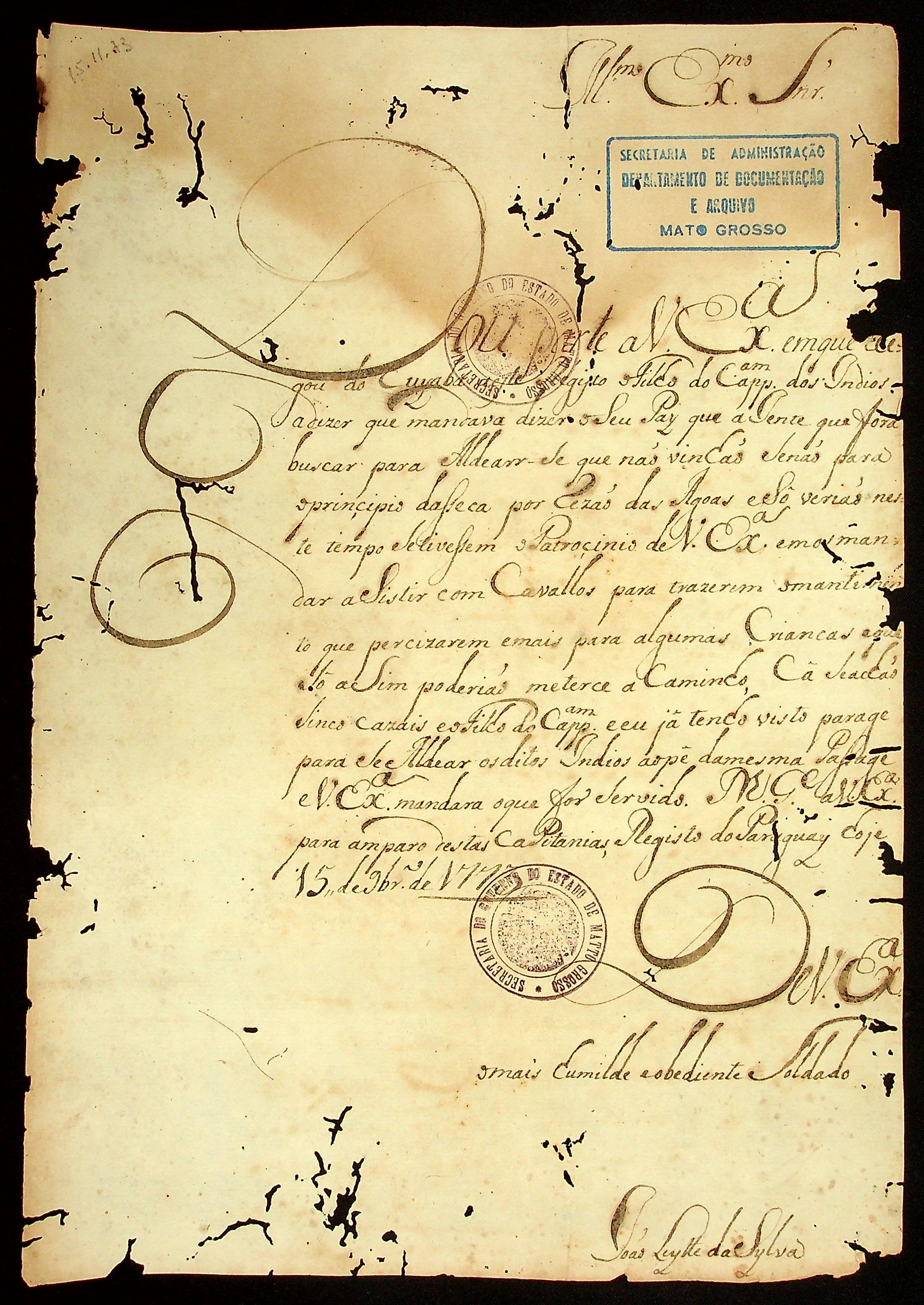 CARTA de João Leite da Silva ao [Governador e Capitão-General da Capitania de Mato Grosso Luiz de Albuquerque de Mello Pereira e Cáceres].
