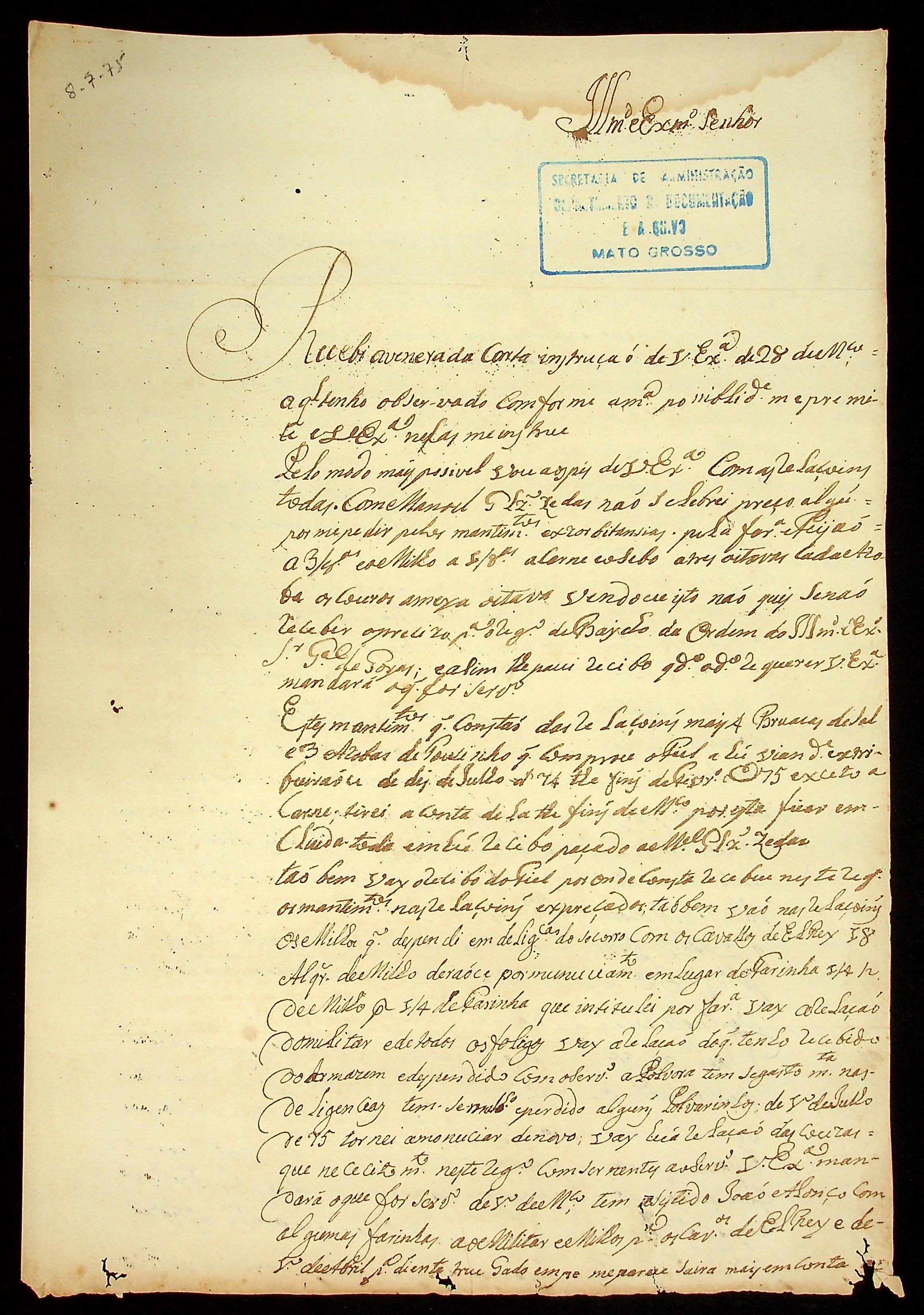 CARTA do Soldado Domingos Barboza de Lima ao Governador e Capitão-General da Capitania de Mato Grosso Luiz de Albuquerque de Mello Pereira e Cáceres.