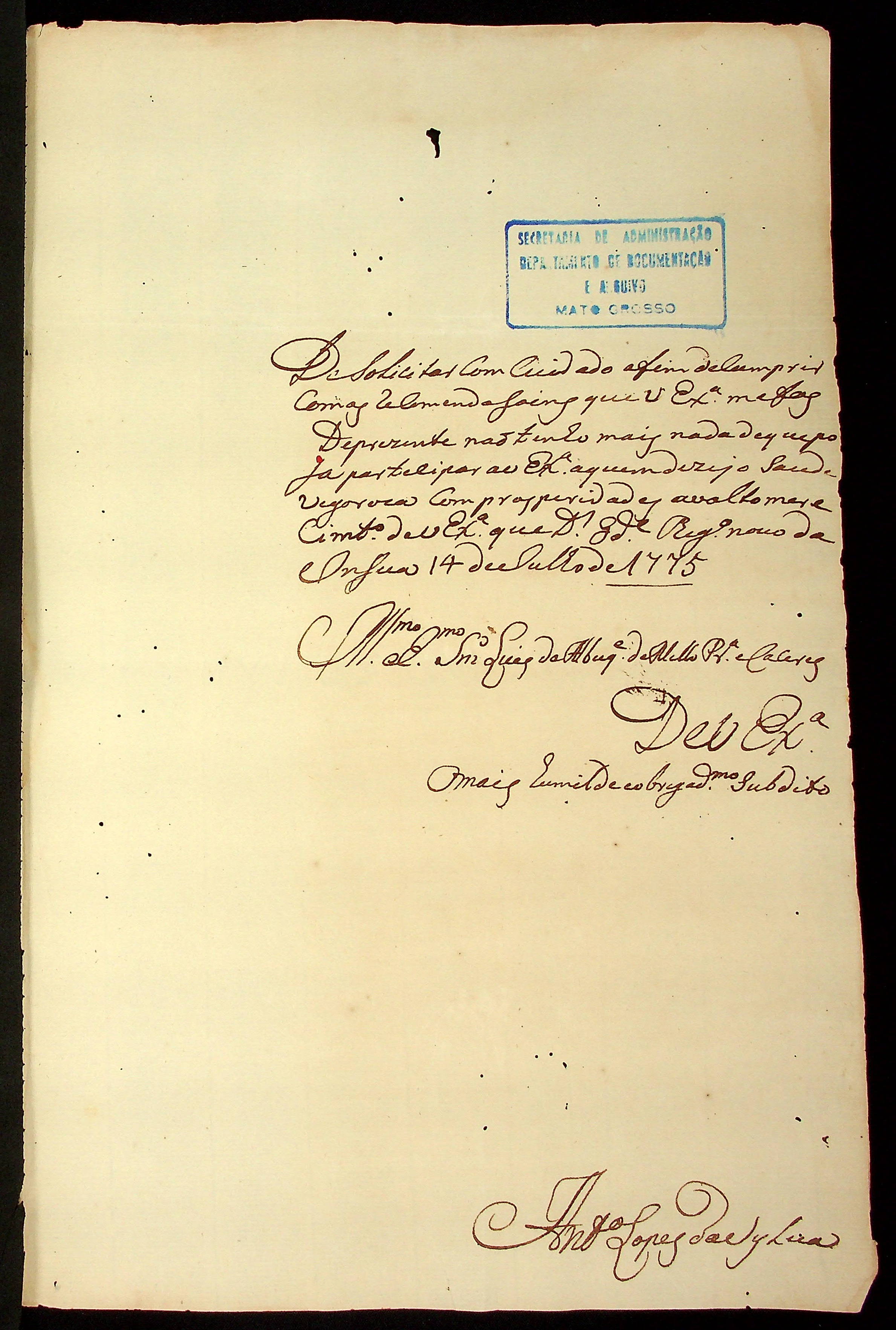 CARTA de Antônio Lopes da Silva ao Governador e Capitão-General da Capitania de Mato Grosso Luiz de Albuquerque de Mello Pereira e Cáceres.