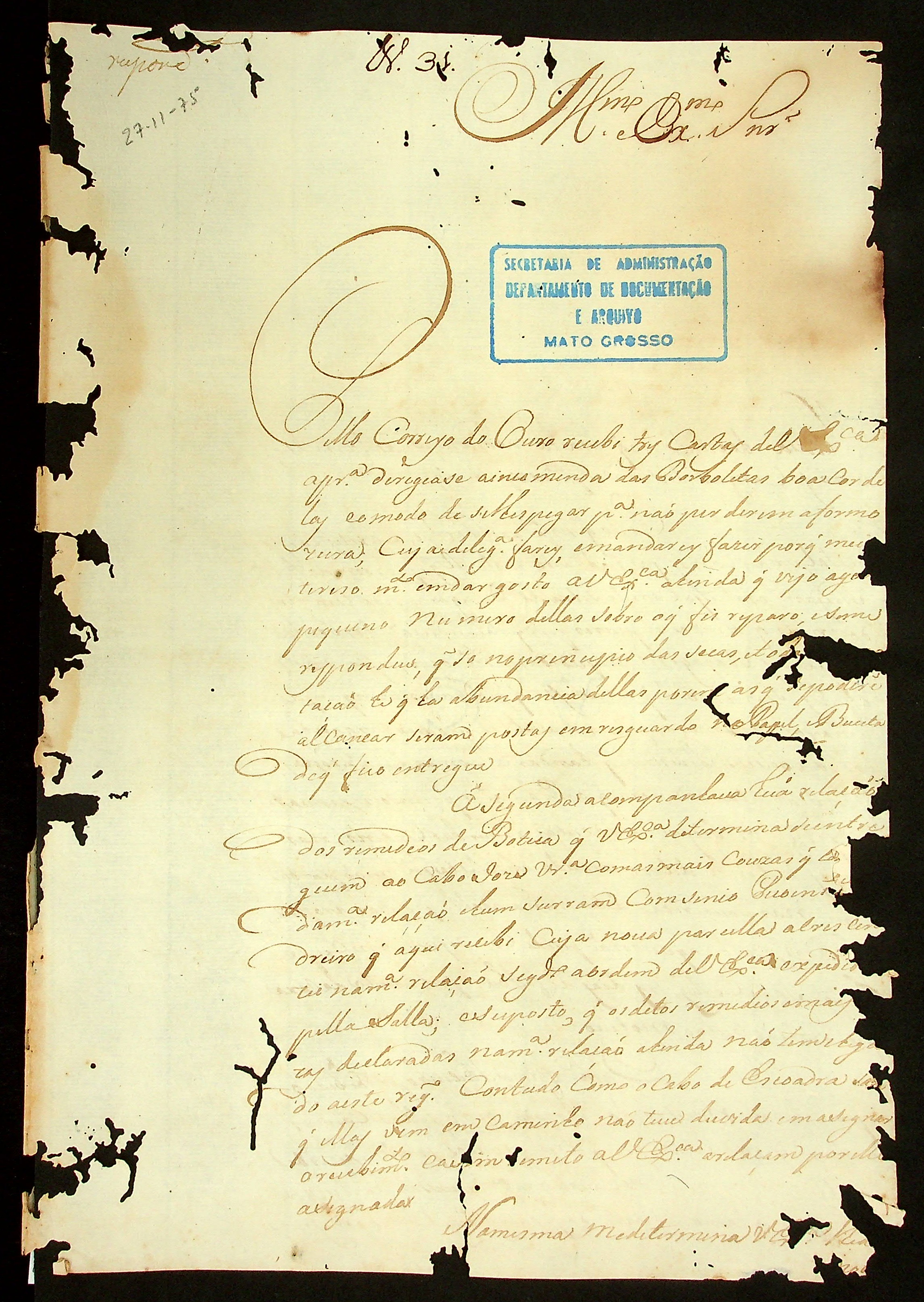 CARTA do [Capitão] Antônio Pinto do Rego Carvalho ao Governador e Capitão-General da Capitania de Mato Grosso Luiz de Albuquerque de Mello Pereira e Cáceres.
