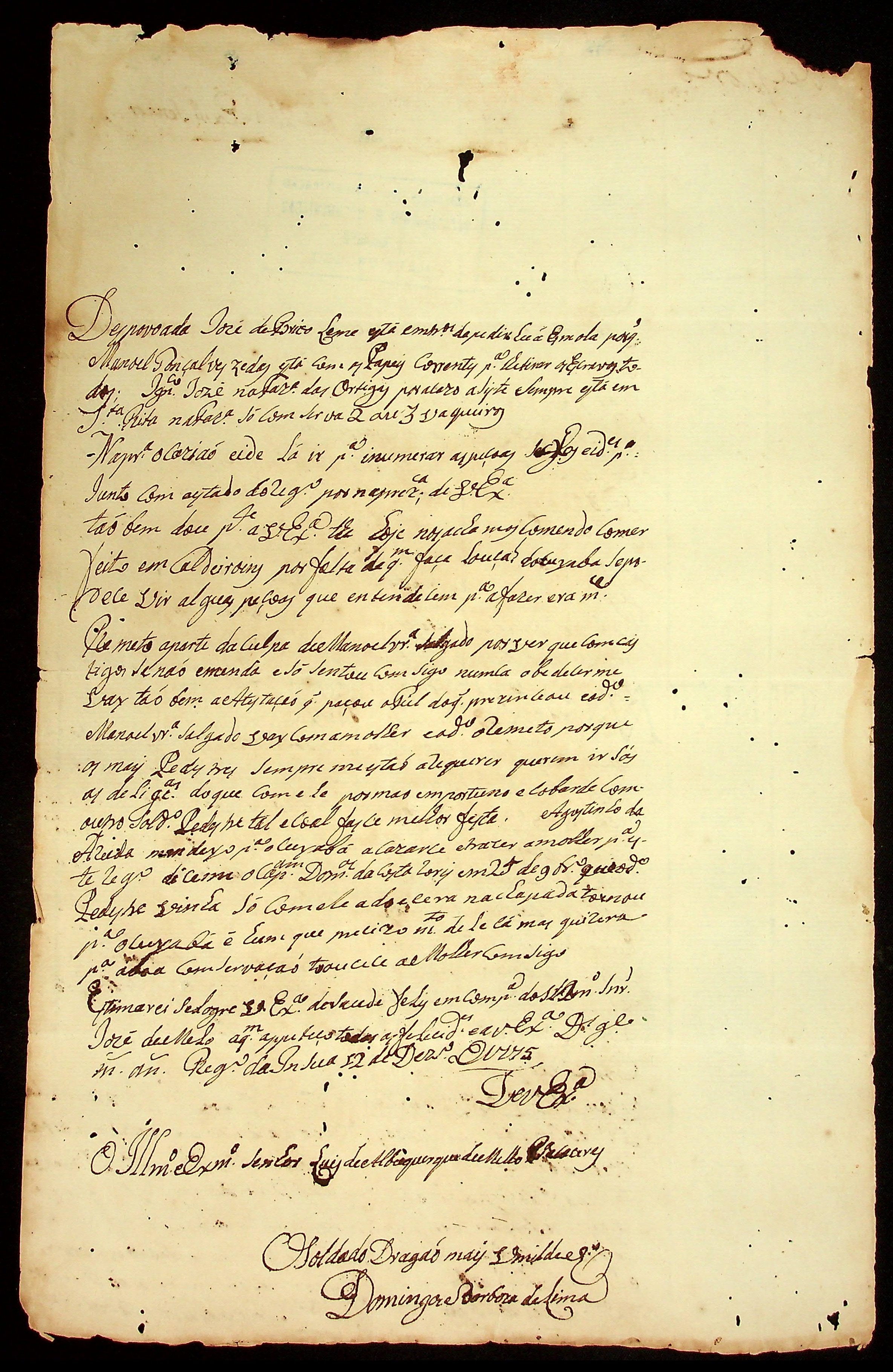 CARTA do Soldado Domingos Barboza de Lima ao Governador e Capitão-General da Capitania de Mato Grosso Luiz de Albuquerque de Mello Pereira e Cáceres.