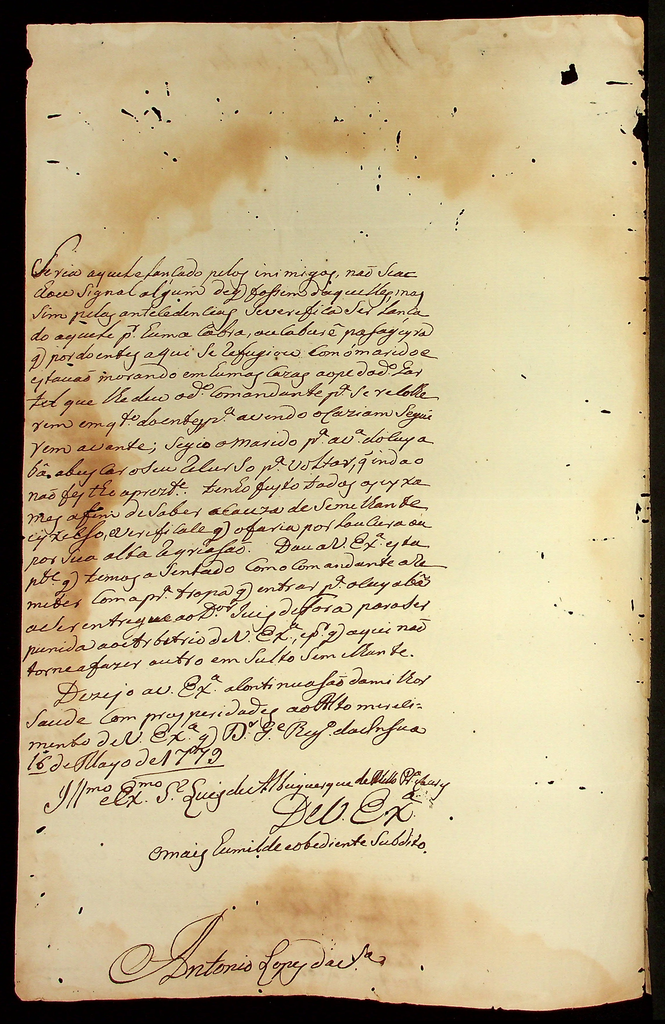 CARTA de Antônio Lopes da Silva ao Governador e Capitão-General da Capitania de Mato Grosso Luiz de Albuquerque de Mello Pereira e Cáceres.