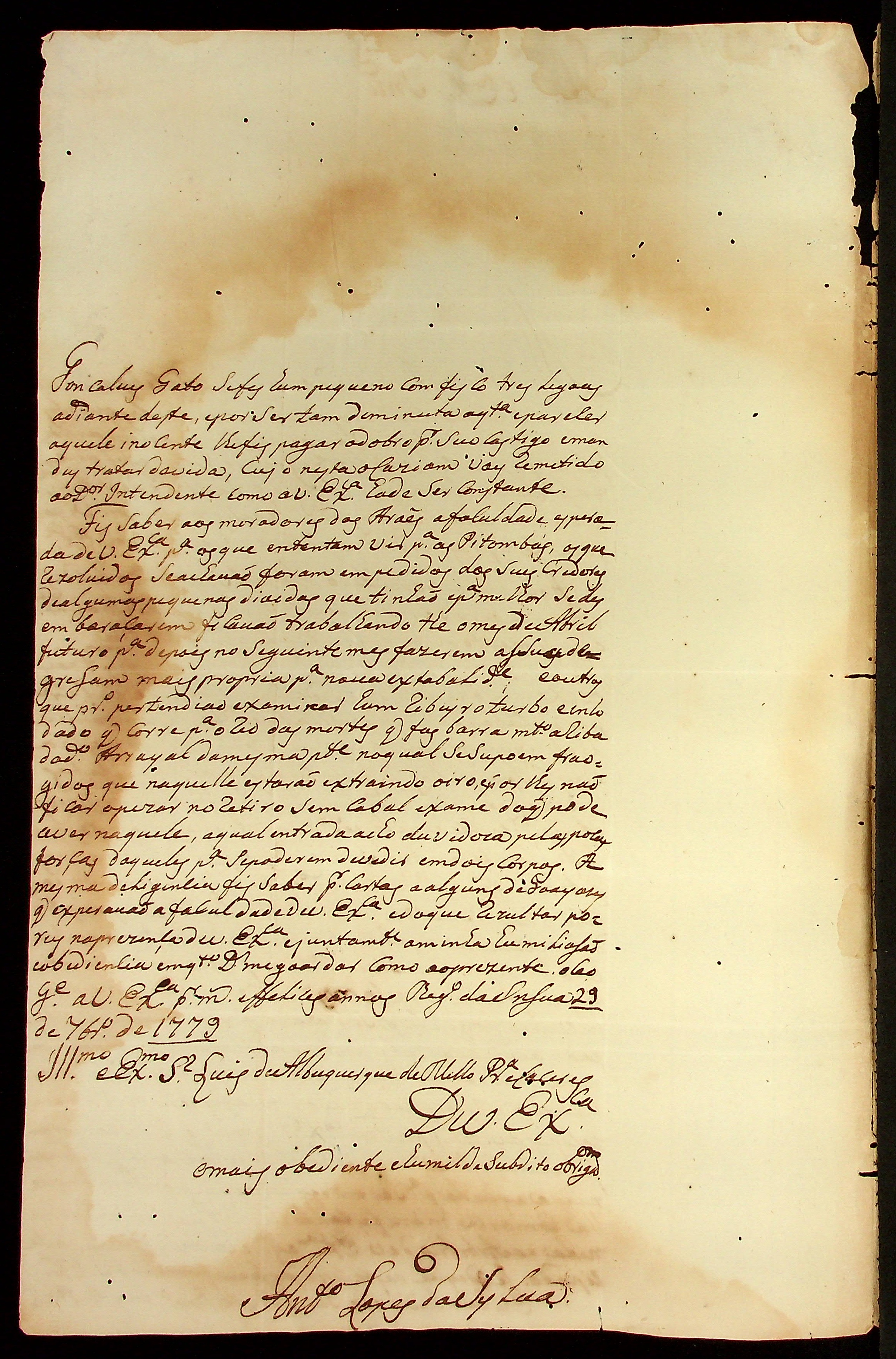 CARTA de Antônio Lopes da Silva ao Governador e Capitão-General da Capitania de Mato Grosso Luiz de Albuquerque de Mello Pereira e Cáceres.