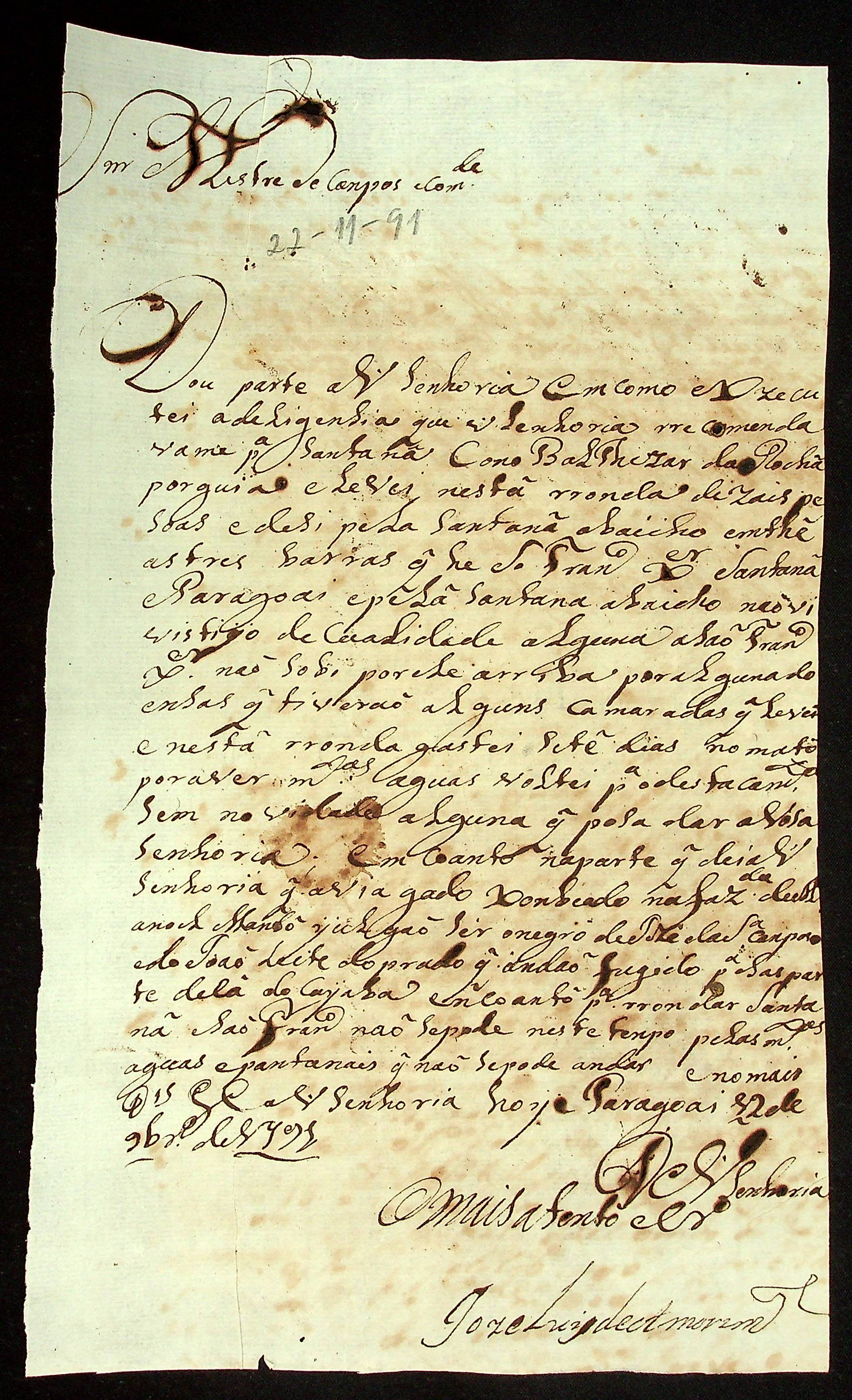 CARTA de José Luiz de Amorim ao Mestre de Campo Antônio José Pinto de Figueiredo.
