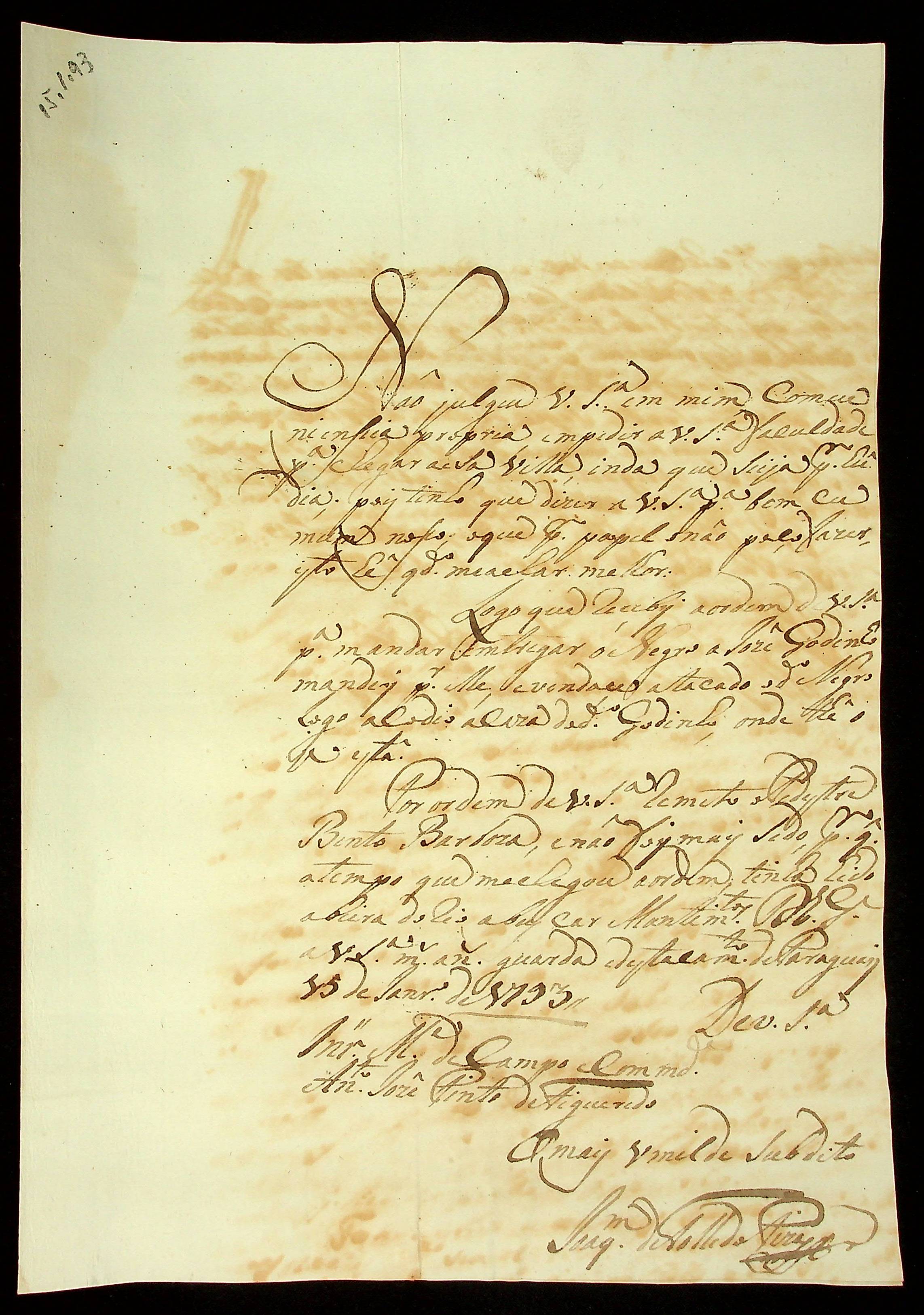 CARTA de Joaquim Toledo [Piza] ao Mestre de Campo Antônio José Pinto de Figueiredo.