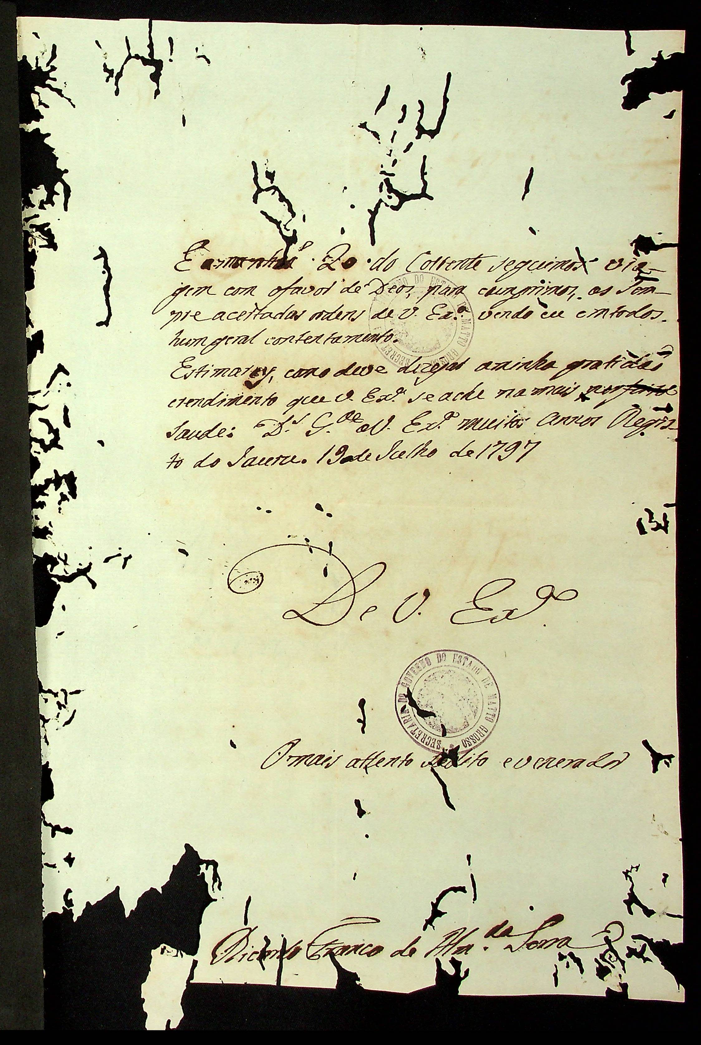 CARTA de Ricardo Franco de Almeida Serra ao [Governador e Capitão-General da Capitania de Mato Grosso Caetano Pinto de Miranda e Montenegro].