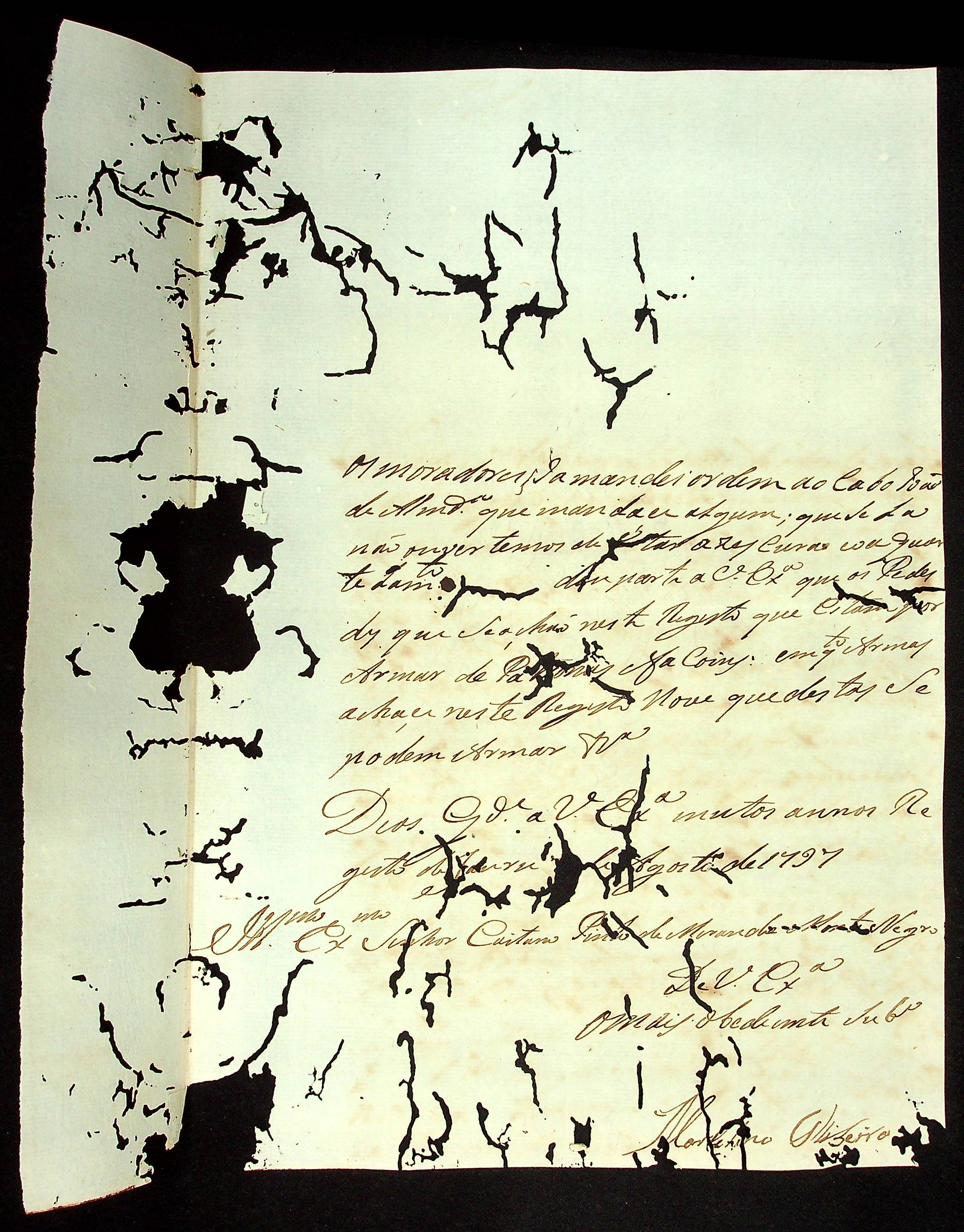 CARTA do [Tenente Comandante] Marcelino Ribeiro ao Governador e Capitão-General da Capitania de Mato Grosso Caetano Pinto de Miranda e Montenegro.