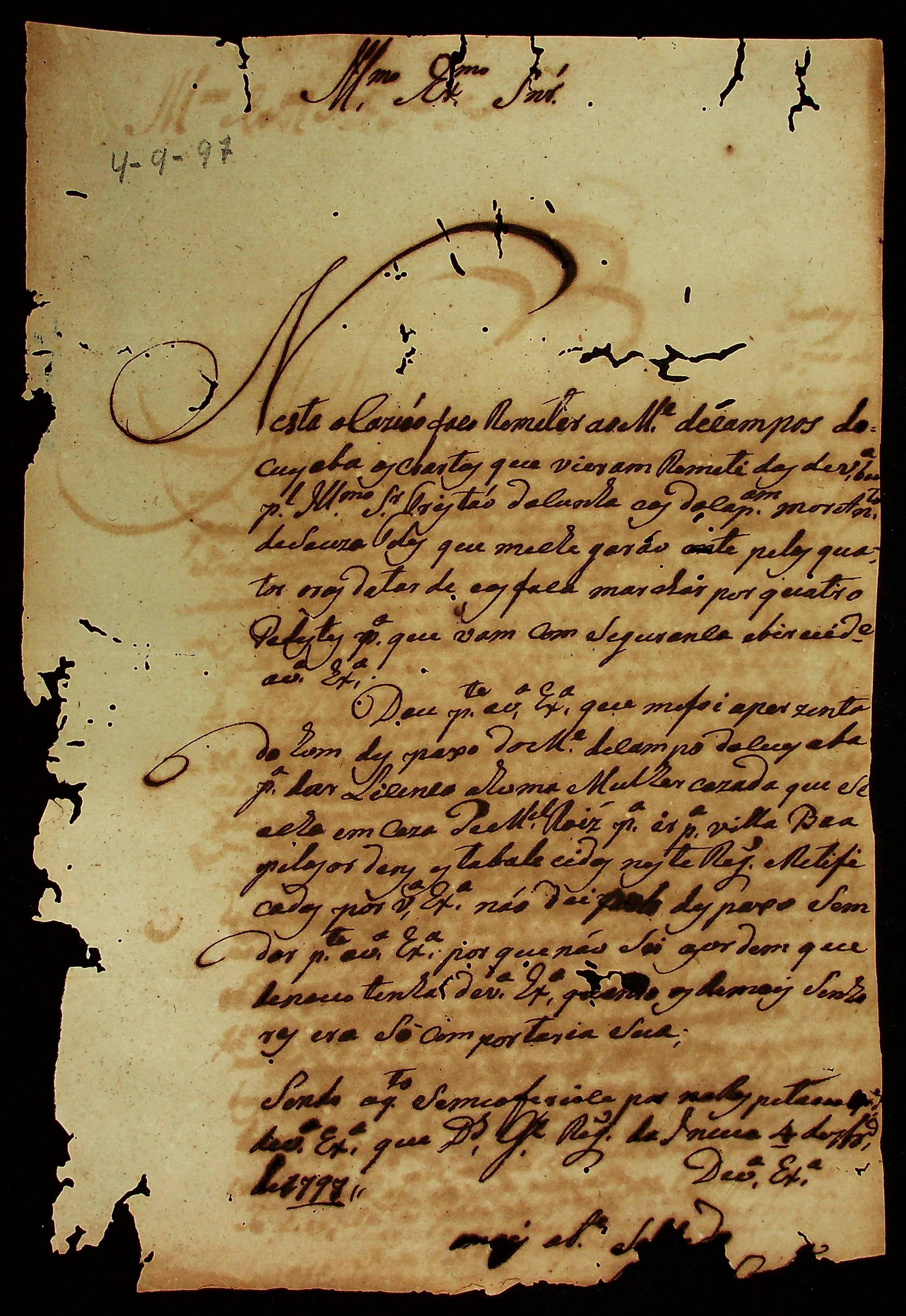 CARTA enviada ao [Governador e Capitão-General da Capitania de Mato Grosso Caetano Pinto de Miranda e Montenegro].