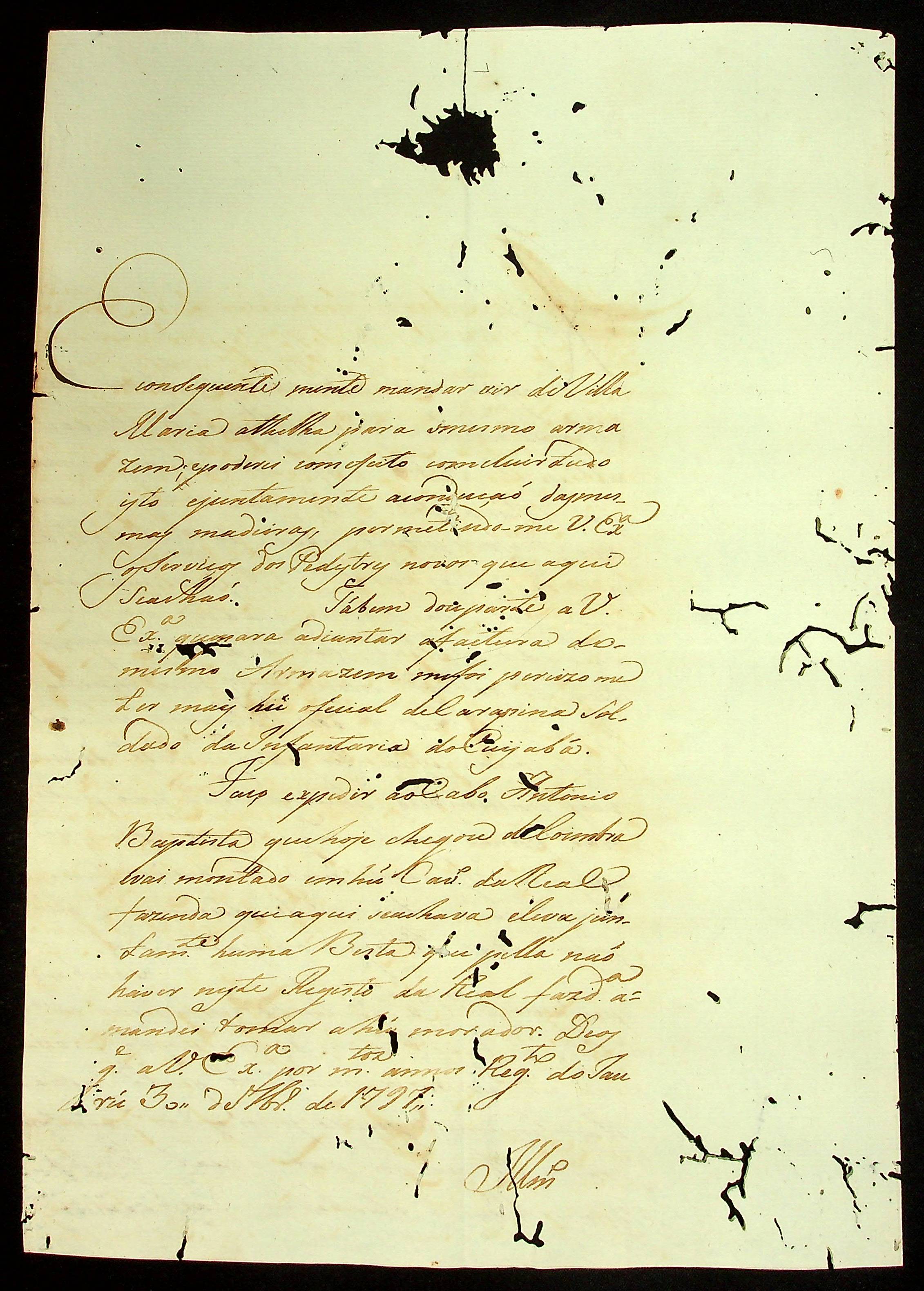 CARTA do [Tenente Comandante] Marcelino Ribeiro ao Governador e Capitão-General da Capitania de Mato Grosso Caetano Pinto de Miranda e Montenegro].