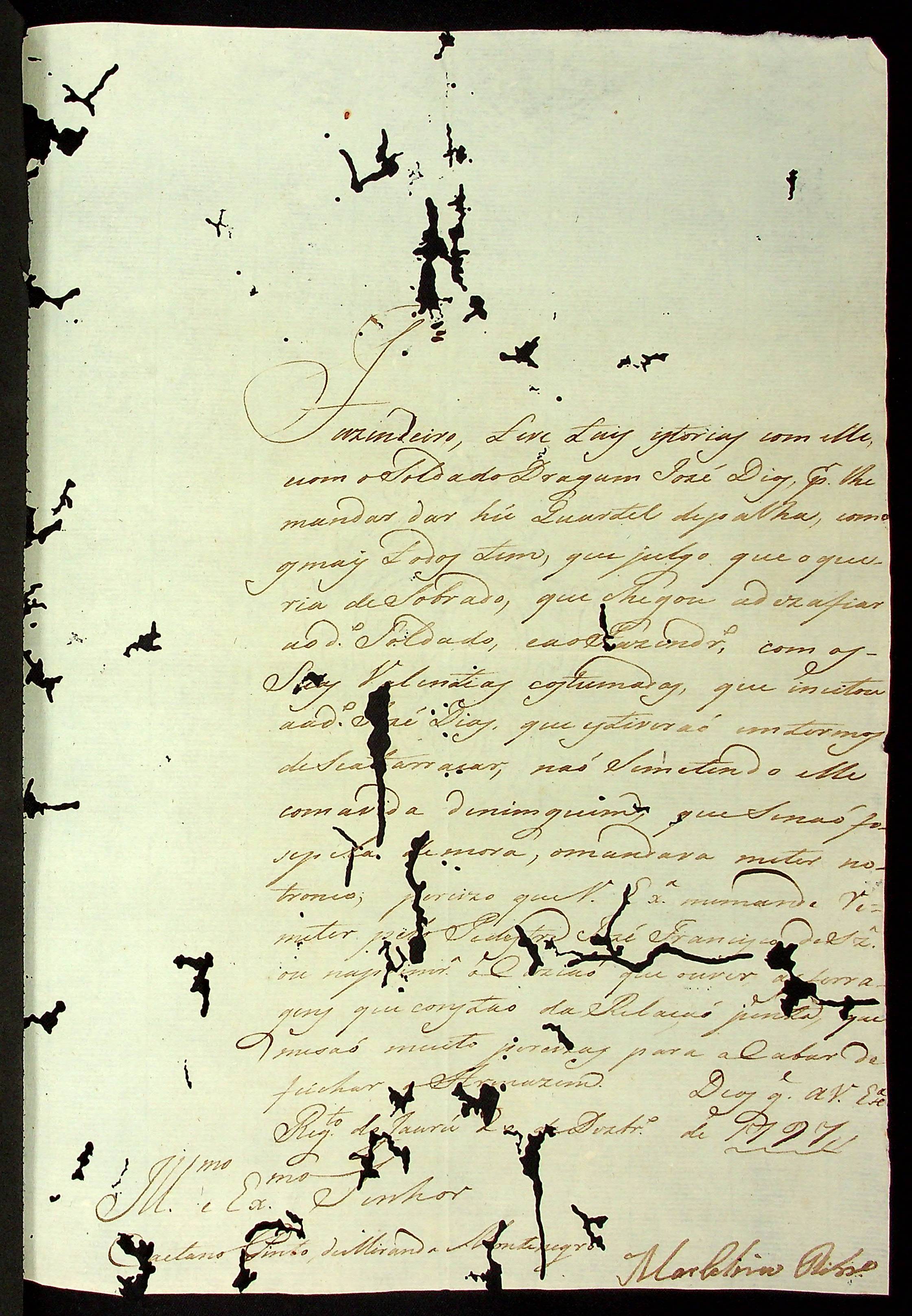 CARTA do [Tenente Comandante] Marcelino Ribeiro ao Governador e Capitão-General da Capitania de Mato Grosso Caetano Pinto de Miranda e Montenegro.