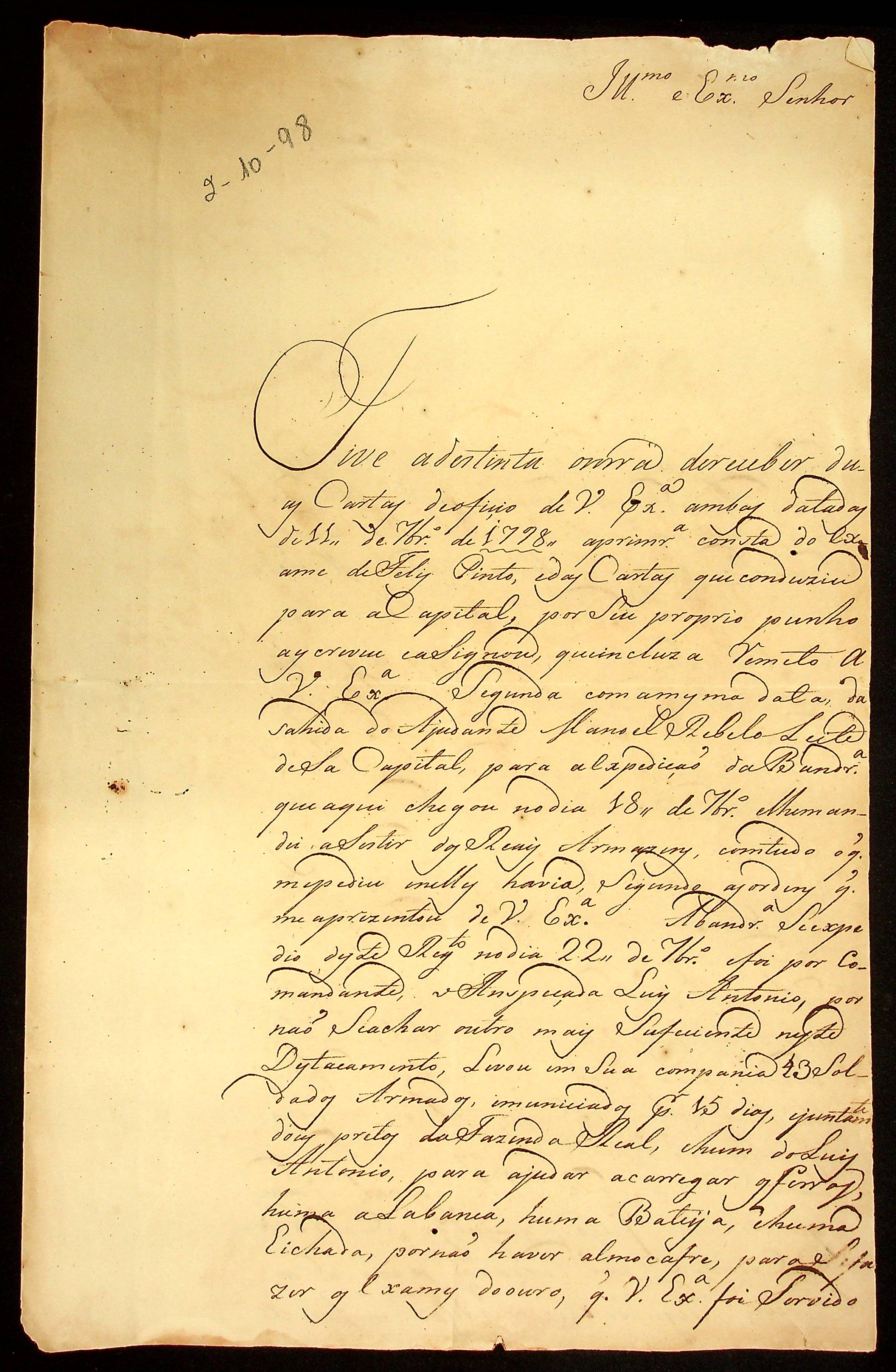 CARTA do [Tenente e Comandante] Marcelino Ribeiro ao Governador e Capitão-General da Capitania de Mato Grosso Caetano Pinto de Miranda e Montenegro.