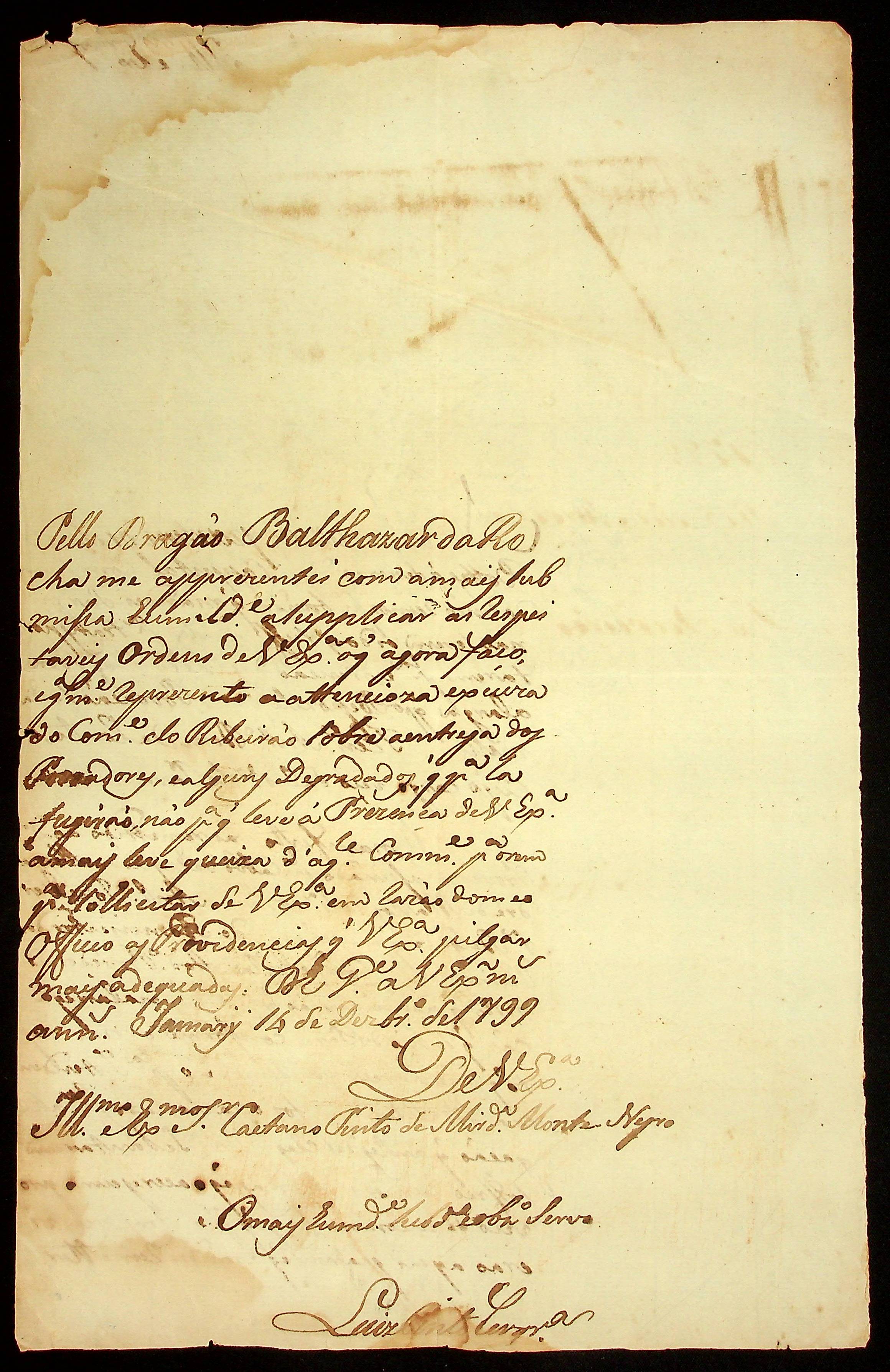 CARTA de Luiz Pinto Cerqueira ao Governador e Capitão-General da Capitania de Mato Grosso Caetano Pinto de Miranda e Montenegro.