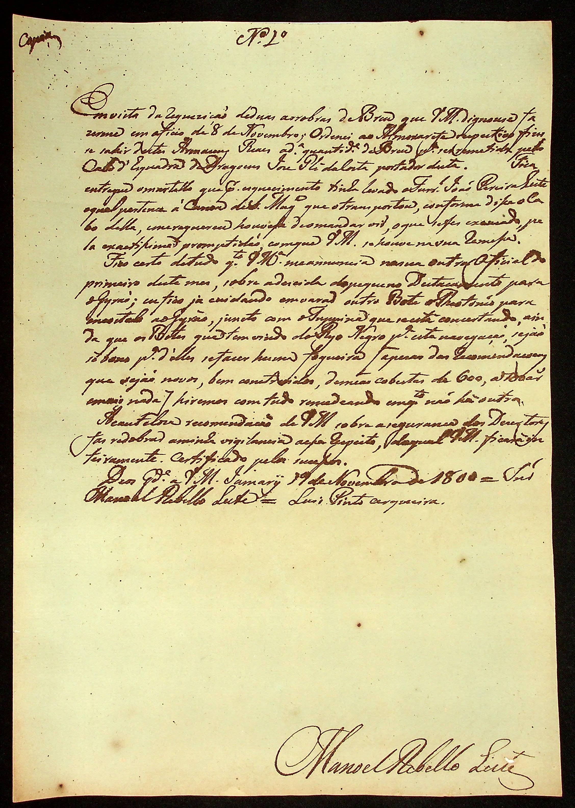 CARTA (cópia) do [Ouvidor] Luís Pinto Cerqueira ao [Ajudante e Comandante] Manoel [Rabelo] Leite.