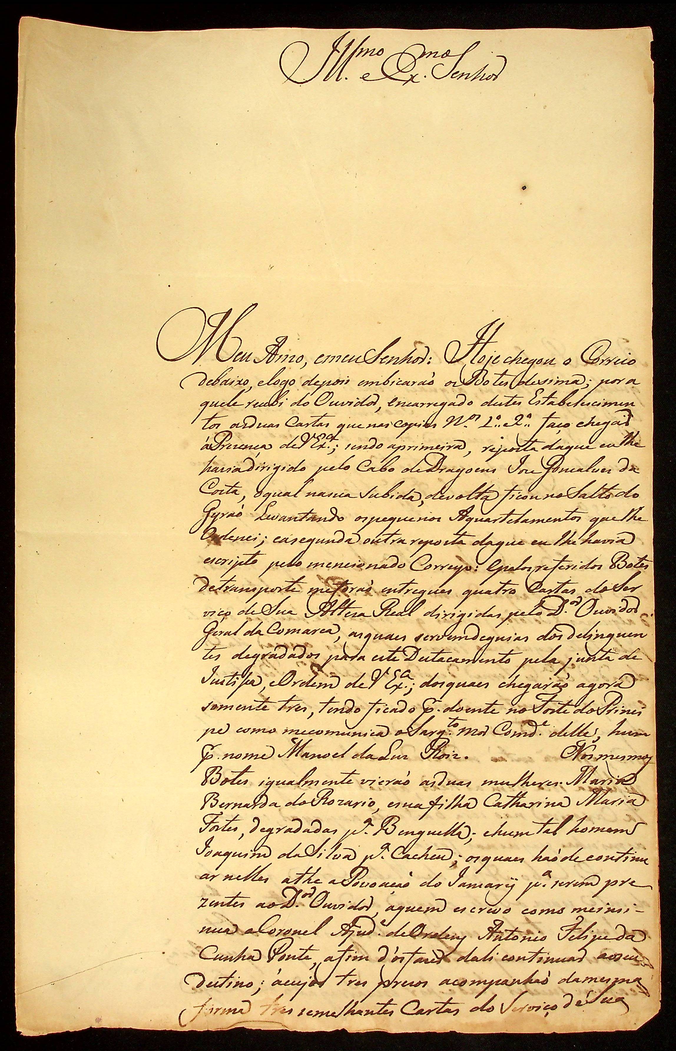 CARTA do [Ajudante e Comandante] Manoel [Rabelo] Leite ao Governador e Capitão-General da Capitania de Mato Grosso Caetano Pinto de Miranda e Montenegro.