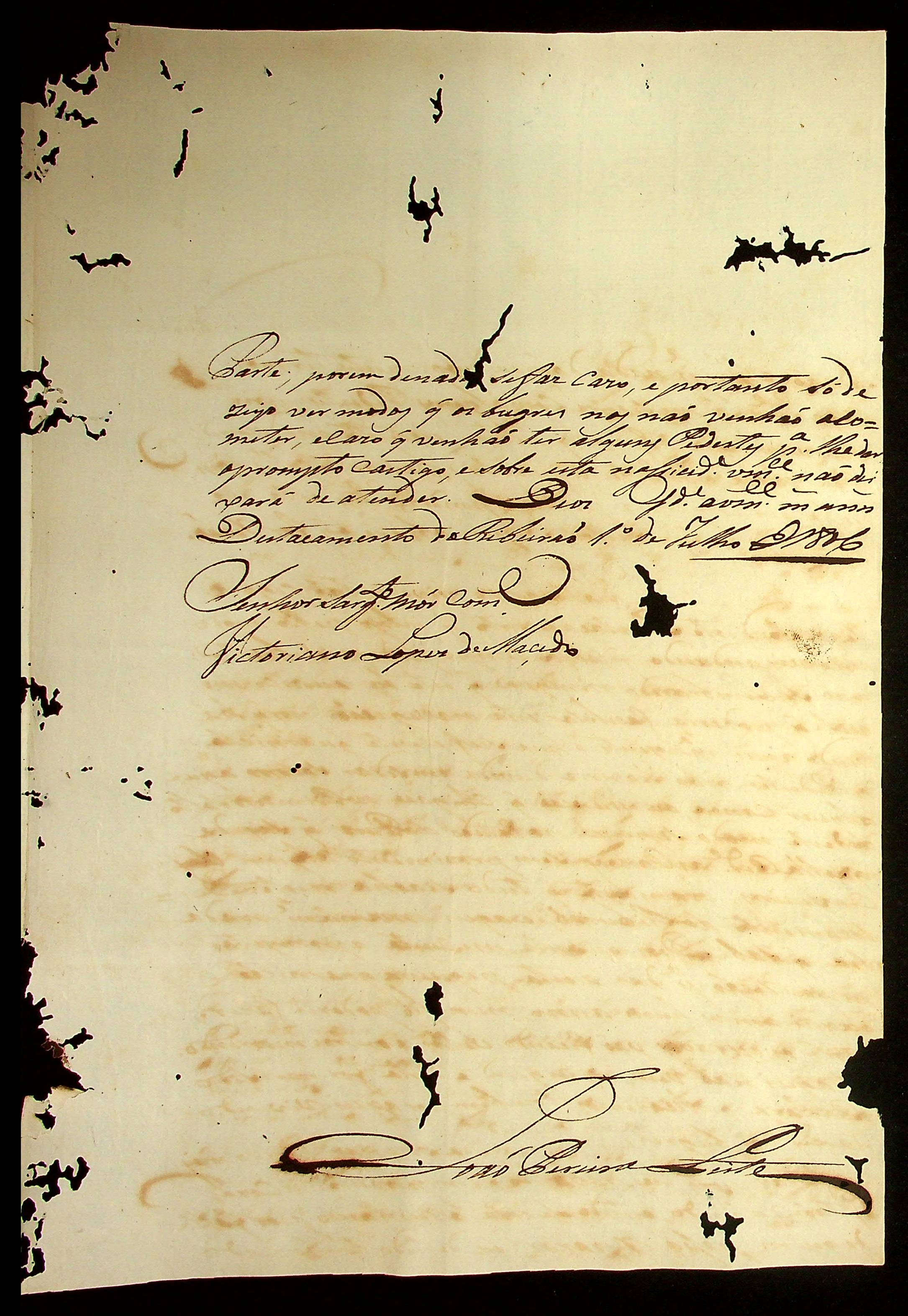 CARTA do [Alferes e Comandante] João Pereira Leite ao Sargento-mor e Comandante Victoriano Lopes de Macedo.