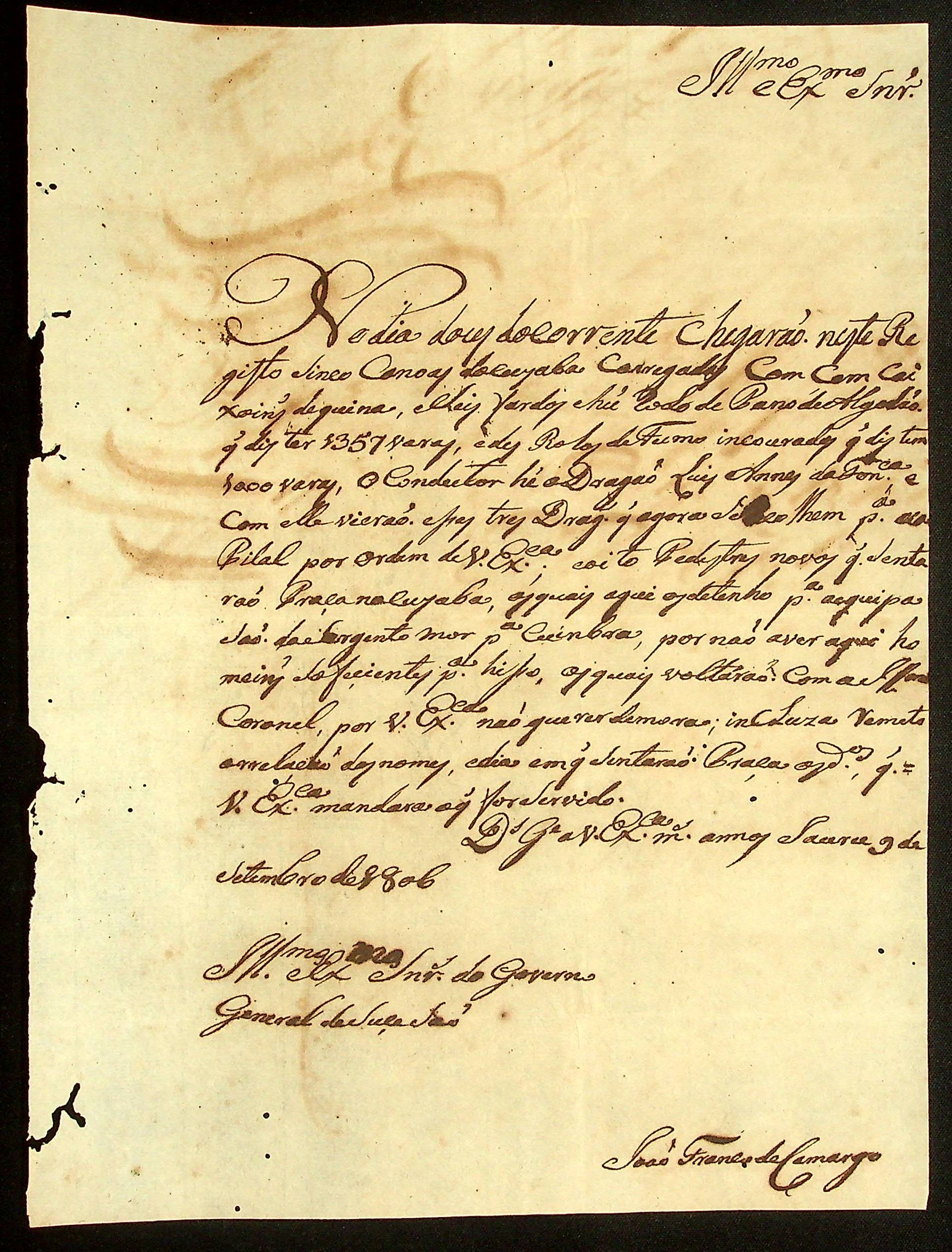 CARTA de João Francisco de Camargo à Terceira Junta Governativa da Capitania de Mato Grosso.