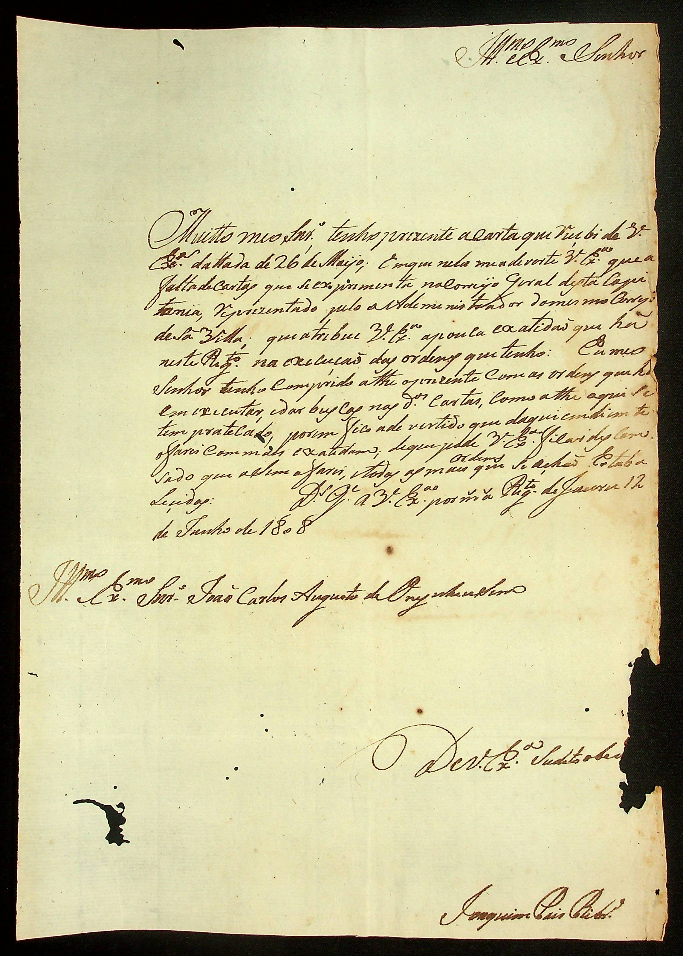 CARTA do [Cabo] Joaquim Paes Ribeiro ao Governador e Capitão-General da Capitania de Mato Grosso João Carlos Augusto d’Oeynhausen e Gravenberg.