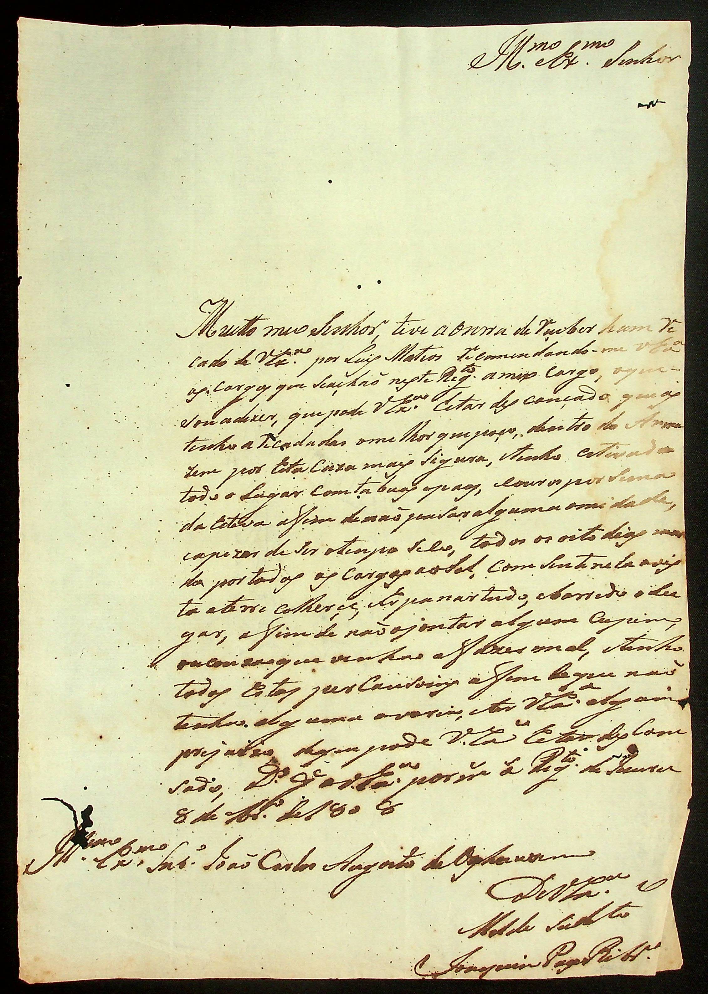 CARTA do [Cabo] Joaquim Paes Ribeiro ao Governador e Capitão-General da Capitania de Mato Grosso João Carlos Augusto d’Oeynhausen e Gravenberg.