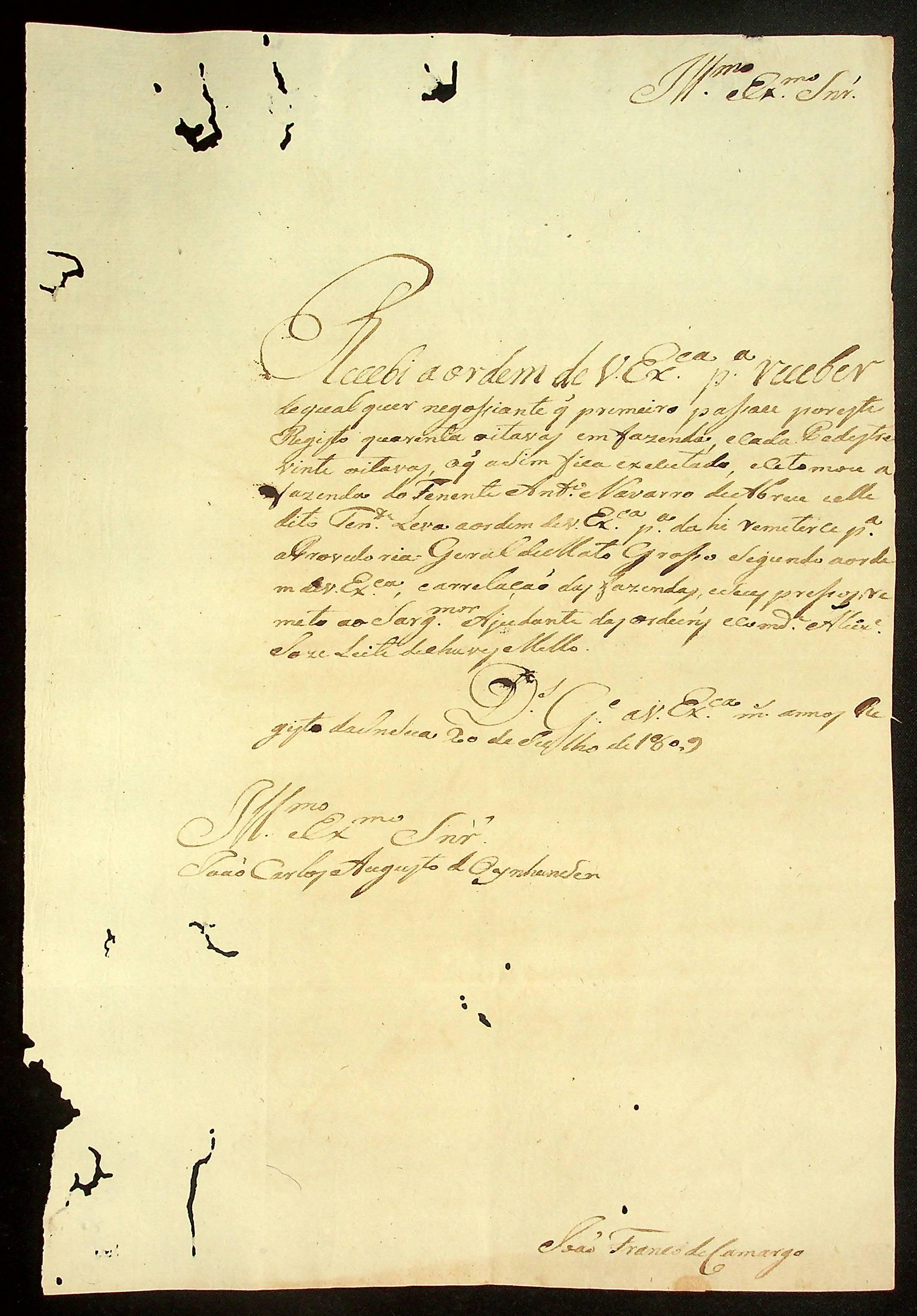 CARTA de João Franco de Camargo ao Governador e Capitão-General da Capitania de Mato Grosso João Carlos Augusto d’Oeynhausen e Gravenberg.