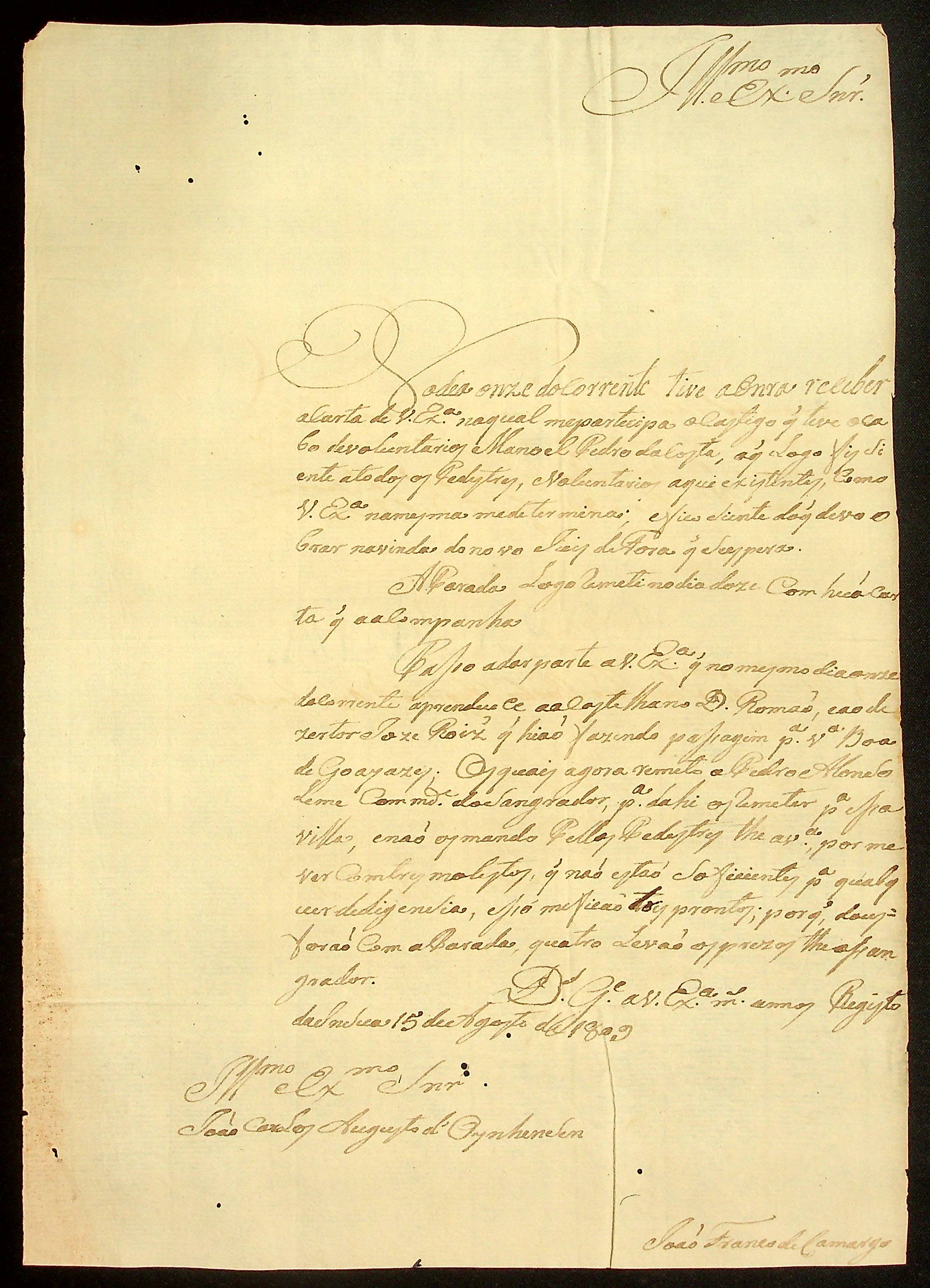 CARTA de João Franco de Camargo ao Governador e Capitão-General da Capitania de Mato Grosso João Carlos Augusto d’Oeynhausen e Gravenberg.