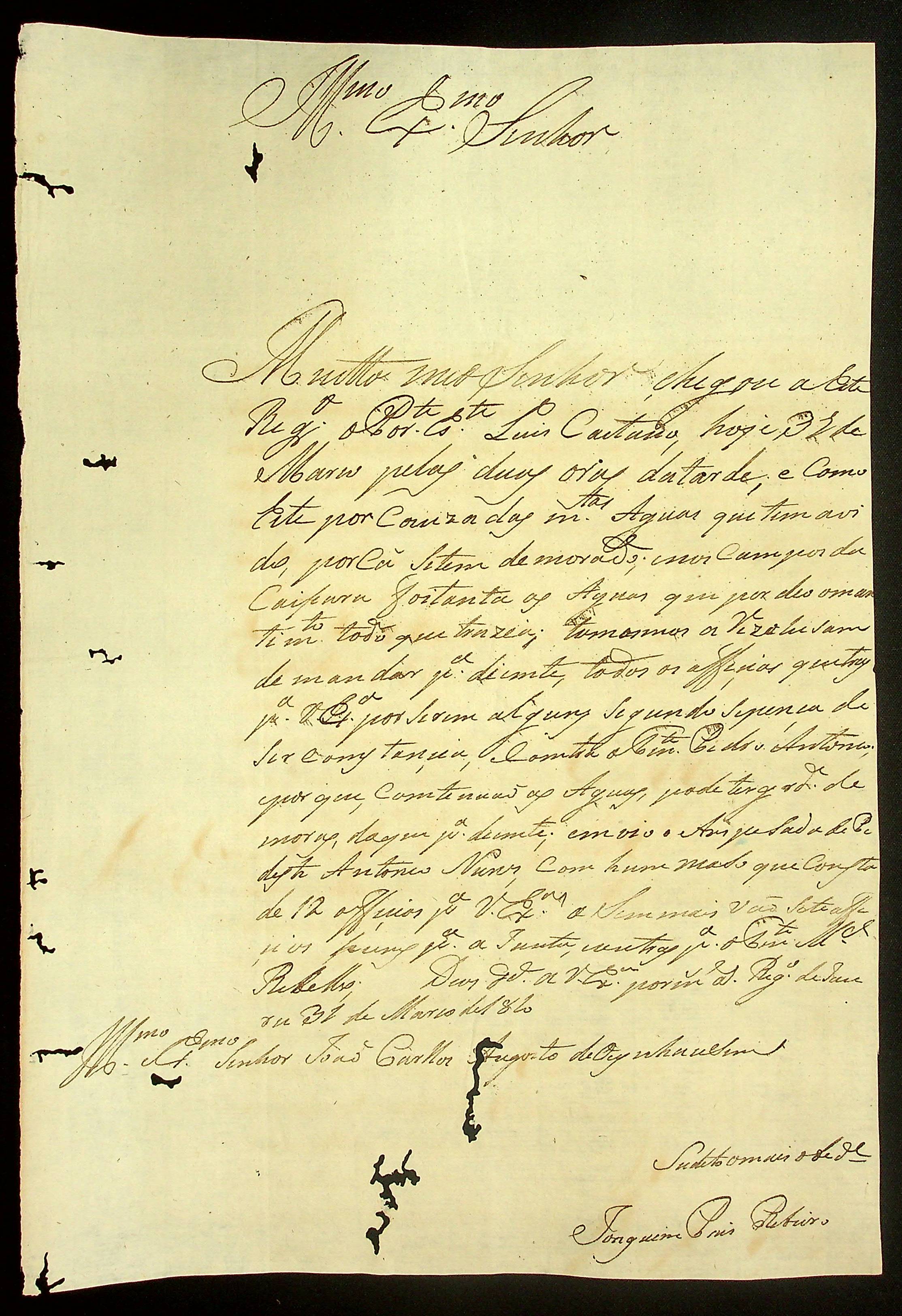 CARTA de Joaquim Paes Ribeiro ao Governador e Capitão-General da Capitania de Mato Grosso João Carlos Augusto d’Oeynhausen e Gravenberg.
