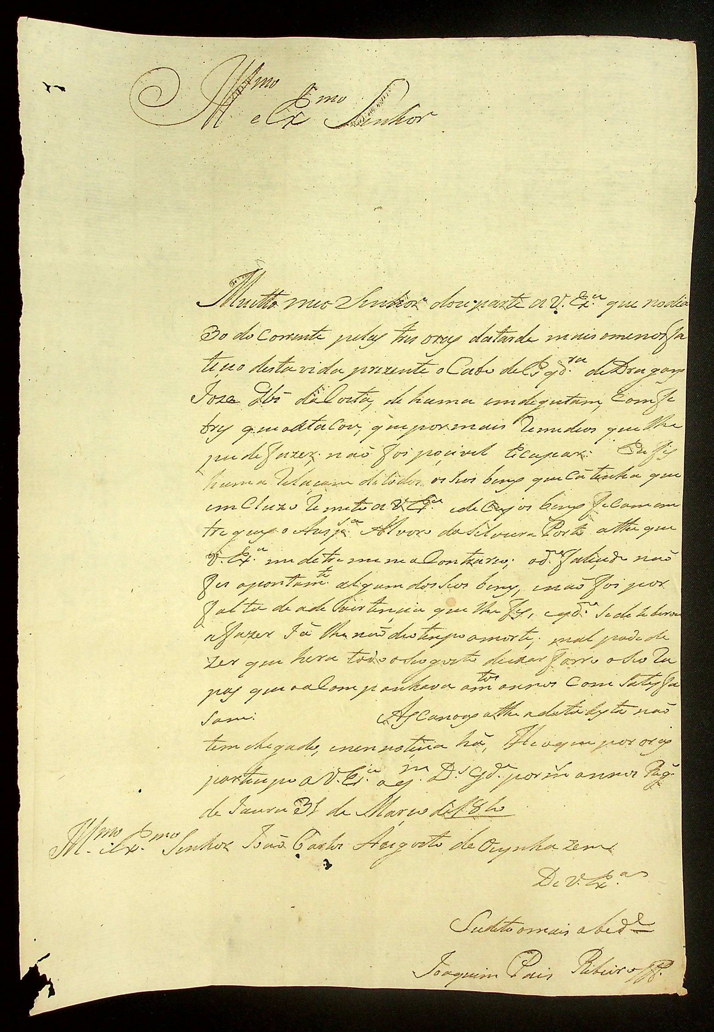 CARTA do [Cabo] Joaquim Paes Ribeiro ao Governador e Capitão-General da Capitania de Mato Grosso João Carlos Augusto d’Oeynhausen e Gravenberg.