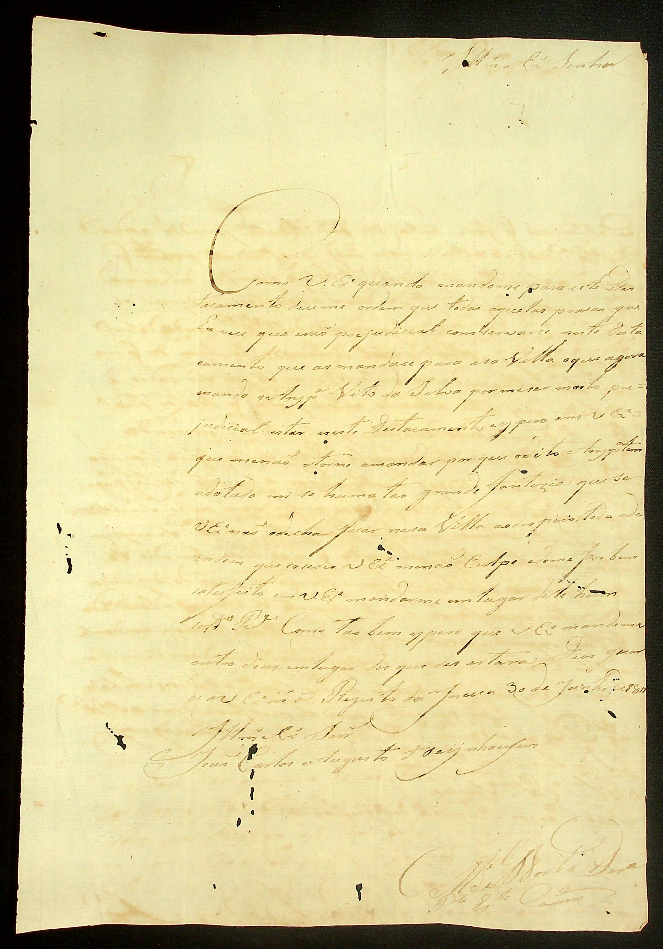 CARTA do Porta-Estandarte e Comandante Manoel Borba [Pereira] ao Governador e Capitão-General da Capitania de Mato Grosso João Carlos Augusto d’Oeynhausen e Gravenberg.