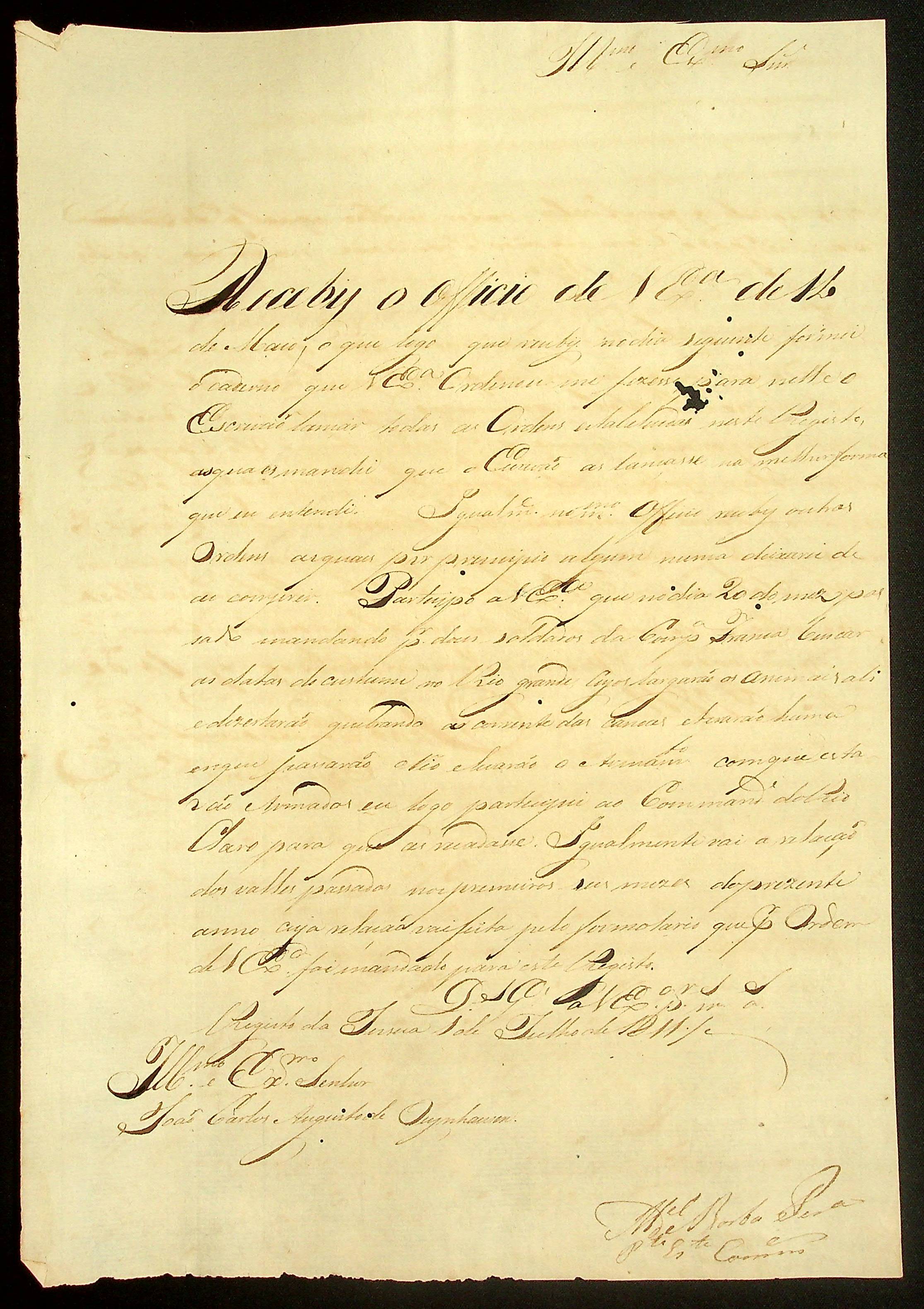 CARTA do Cabo Porta-Estandarte Comandante Manoel Borba Pereira ao Governador e Capitão-General da Capitania de Mato Grosso João Carlos Augusto d’Oeynhausen e Gravenberg.