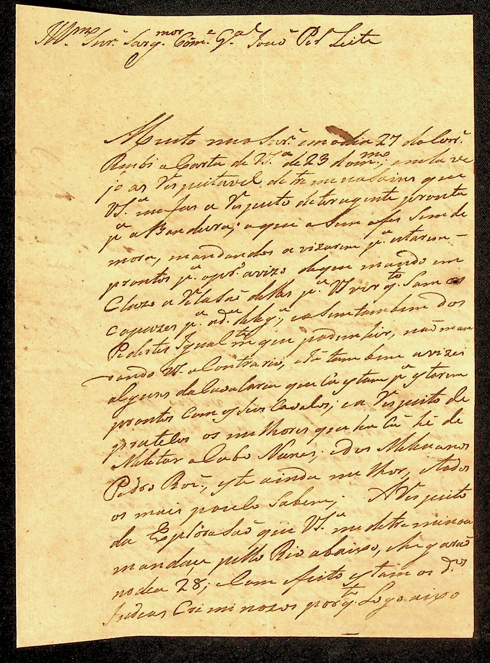 CARTA do [Furriel Comandante] Joaquim Paes Ribeiro ao Sargento-mor Comandante Geral João Pereira Leite.