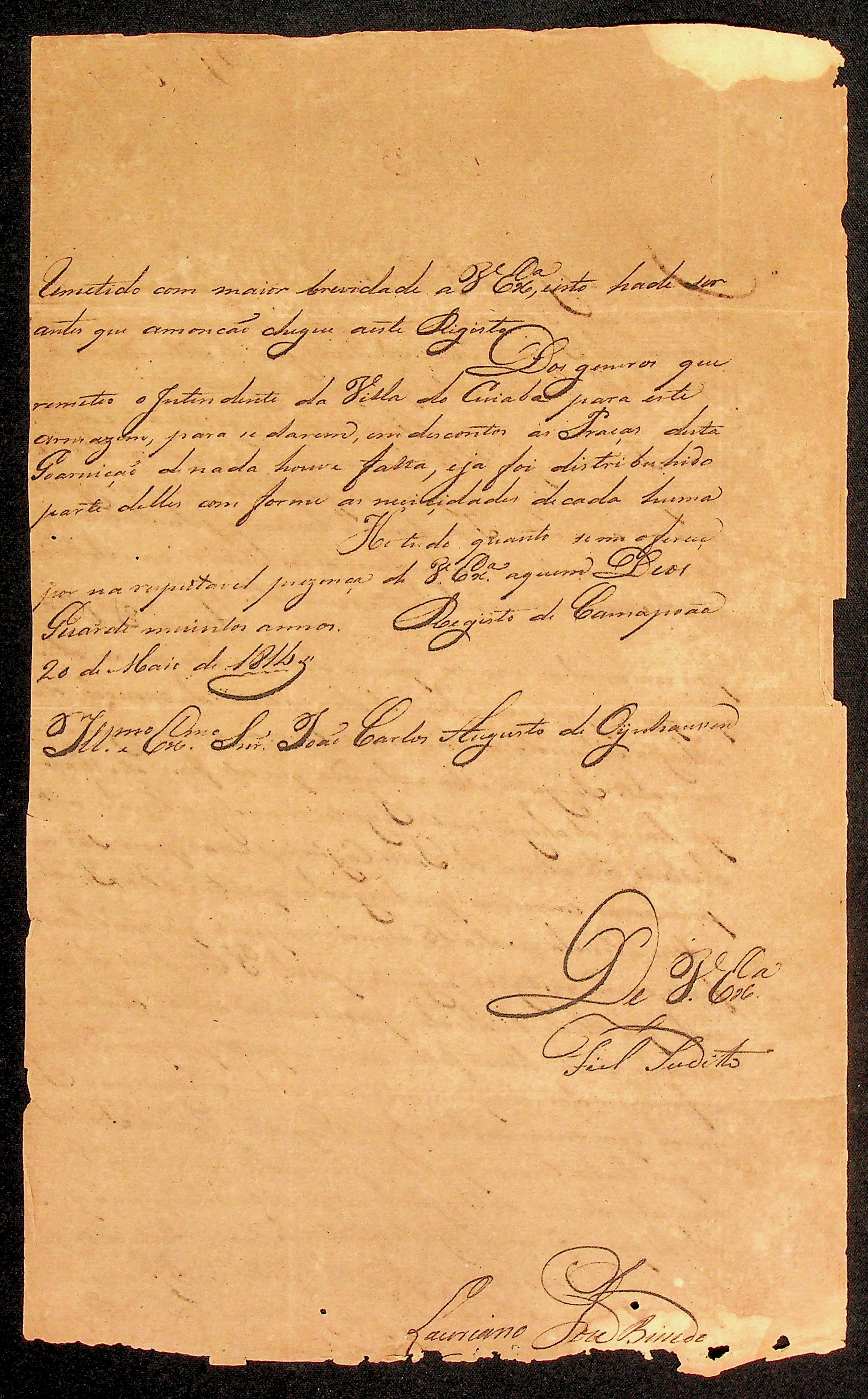 CARTA de Lauriano José Bicudo ao Governador e Capitão-General da Capitania de Mato Grosso João Carlos Augusto d’Oeynhausen e Gravenberg.