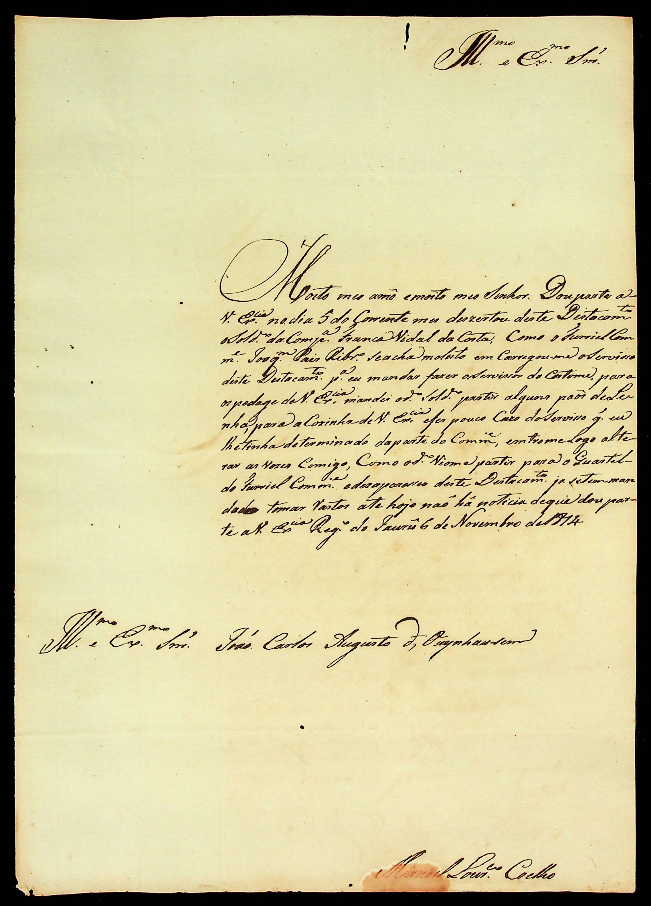 CARTA de Manoel Lourenço Coelho ao Governador e Capitão-General da Capitania de Mato Grosso João Carlos Augusto d’Oeynhausen e Gravenberg.