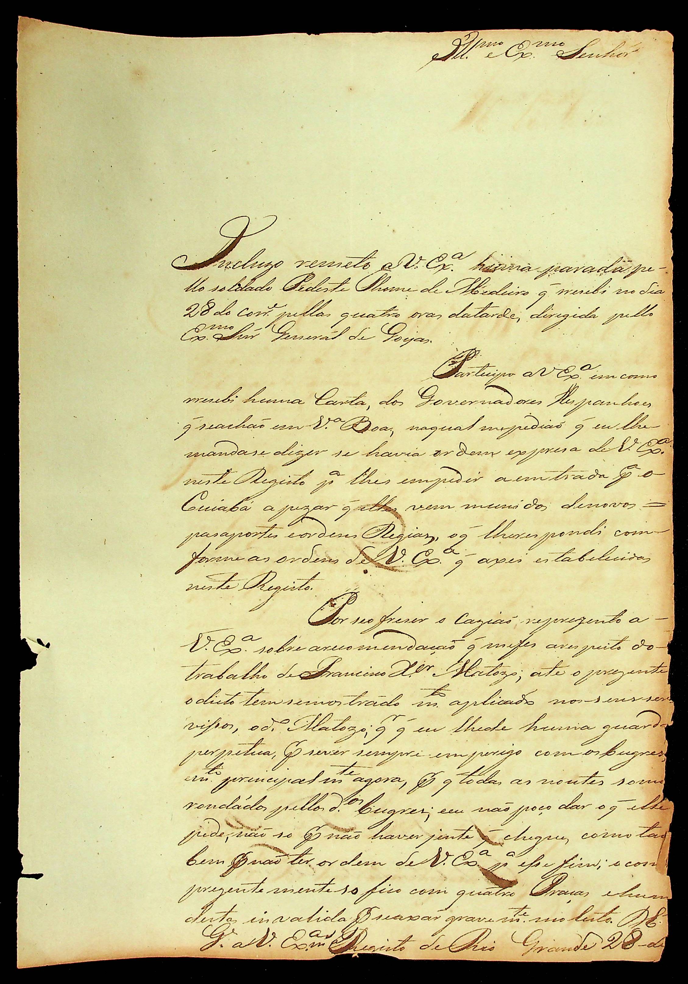 CARTA do [Porta-Estandarte e Comandante] José Ignácio Seixo de Brito ao [Governador e Capitão-General da Capitania de Mato Grosso João Carlos Augusto d’Oeynhausen e Gravenberg].