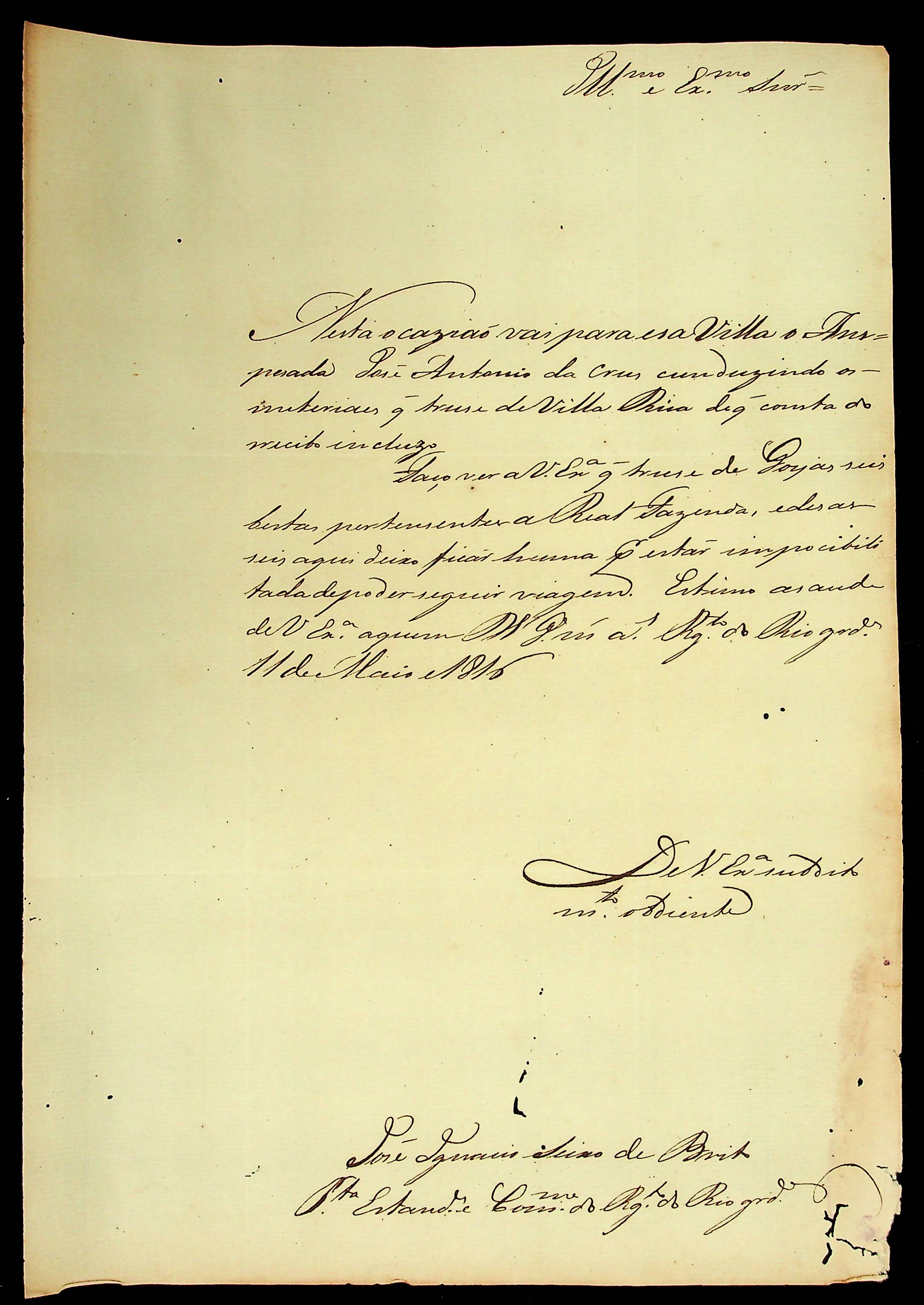 CARTA do [Porta-Estandarte Comandante] José Ignácio Seixo de Brito ao [Governador e Capitão-General da Capitania de Mato Grosso João Carlos Augusto d’Oeynhausen e Gravenberg].