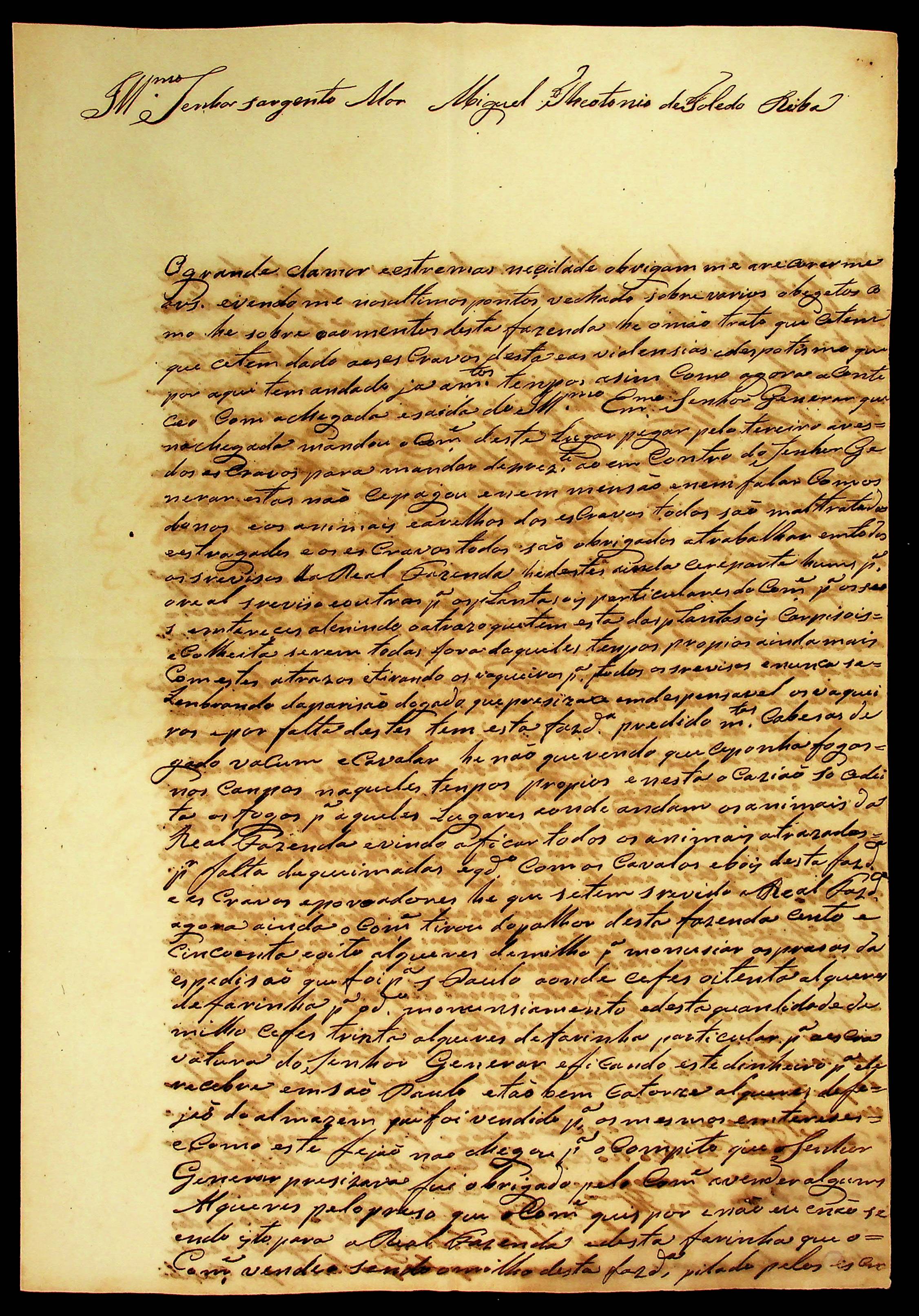 CARTA de José de Arruda Botelho ao Sargento-mor Miguel Theotonio de Toledo Riba.