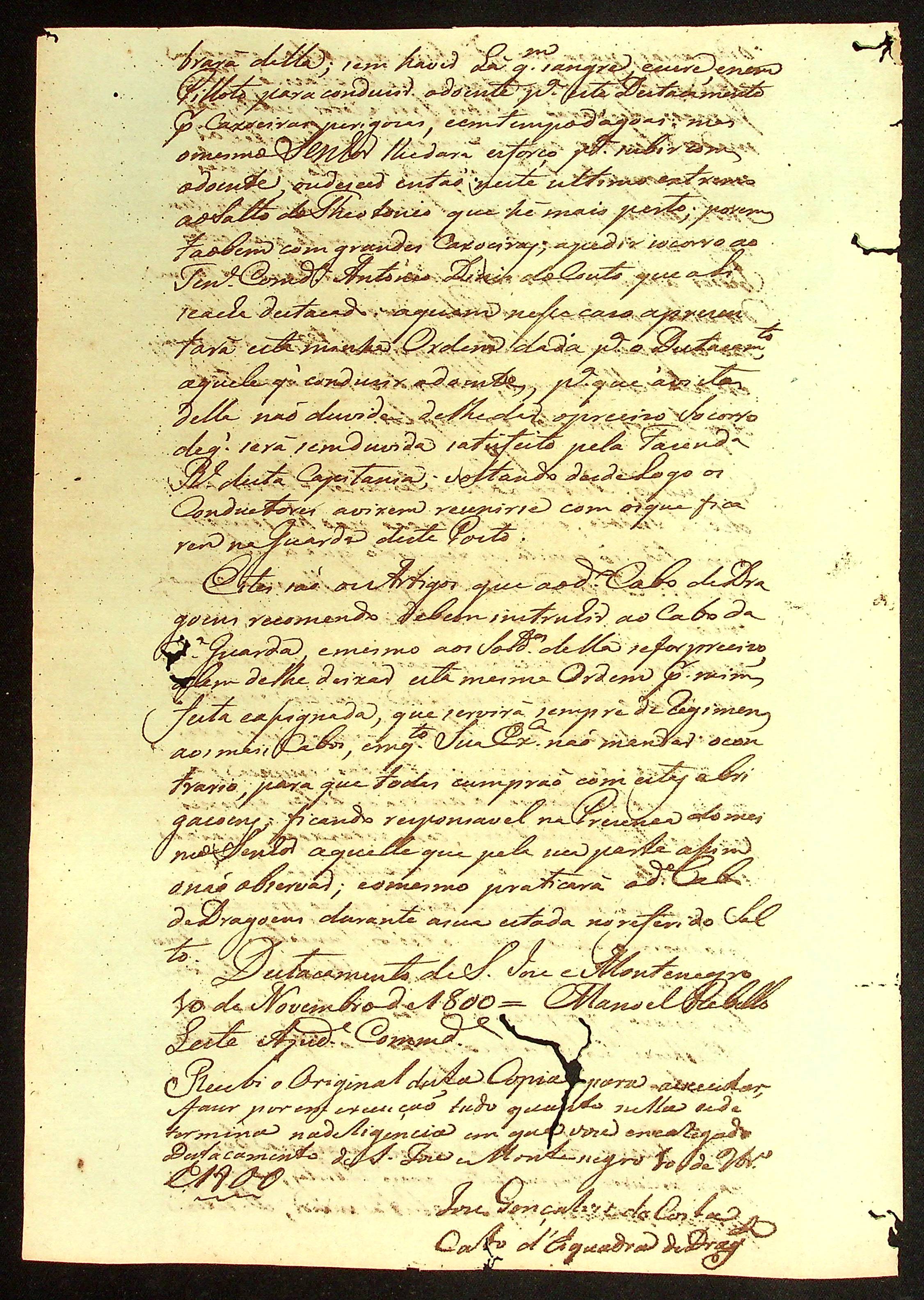 ORDEM (cópia) do [Ajudante e Comandante] Manoel [Rabelo] Leite ao Cabo de Esquadra José Gonçalves da Costa para executar na Povoação de Jamary.