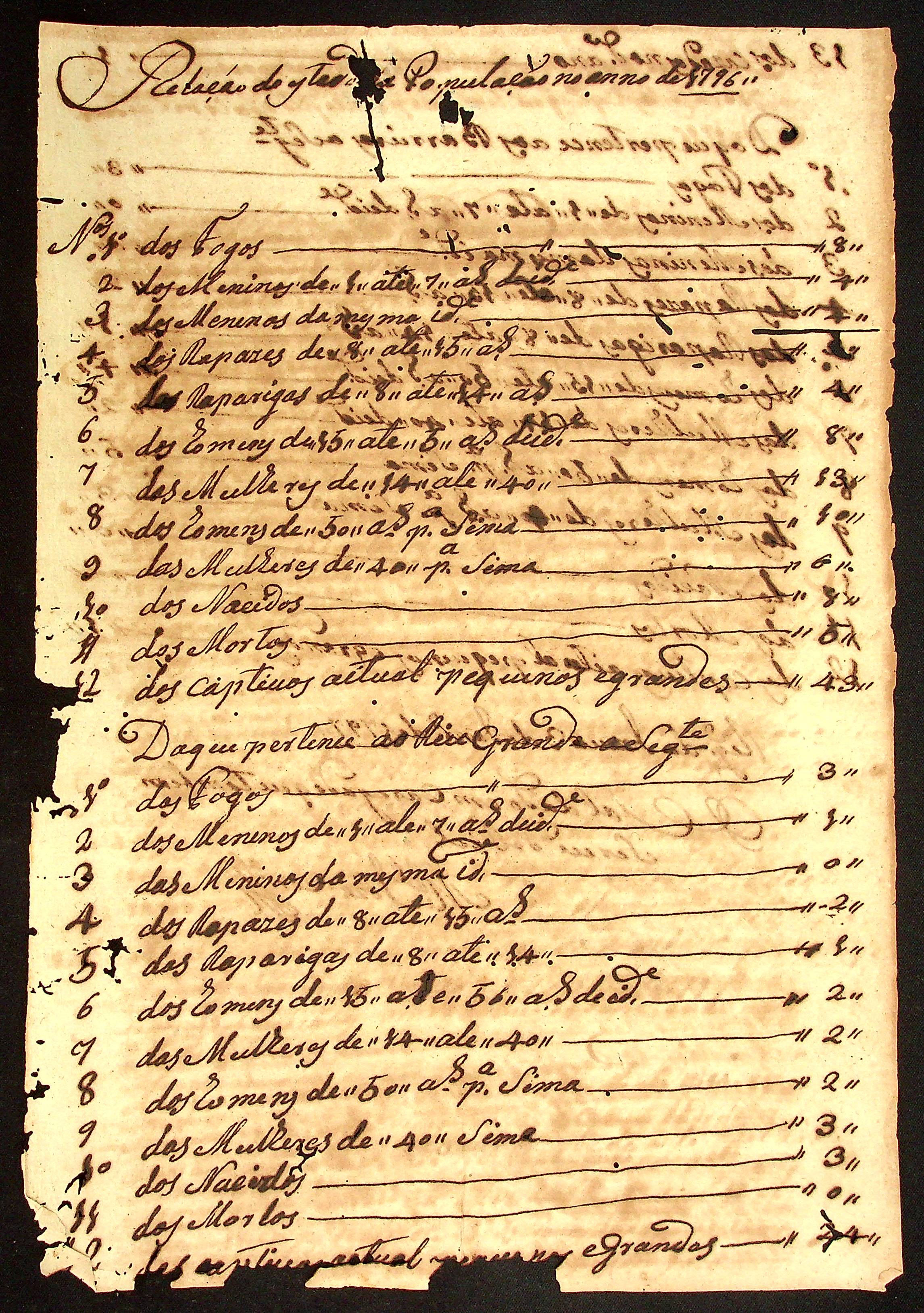 RELAÇÃO da população no Registro da Ínsua no ano de 1796 feita pelo Soldado Manoel José Correa.