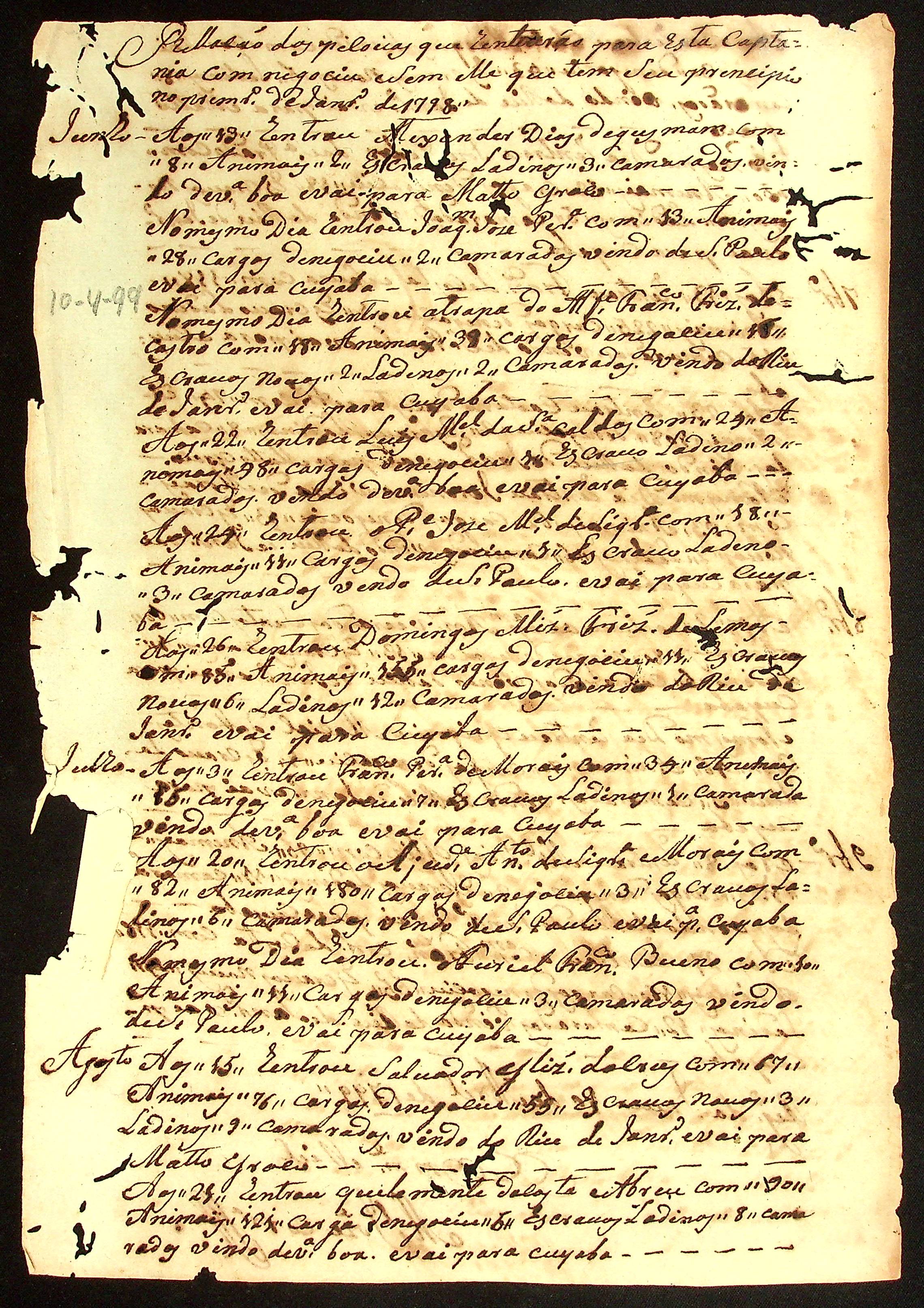 RELAÇÃO das pessoas que entraram para esta Capitania com negócio e sem ele que tem seu princípio no 1º de janeiro de 1798 feita por Manoel José Correa.