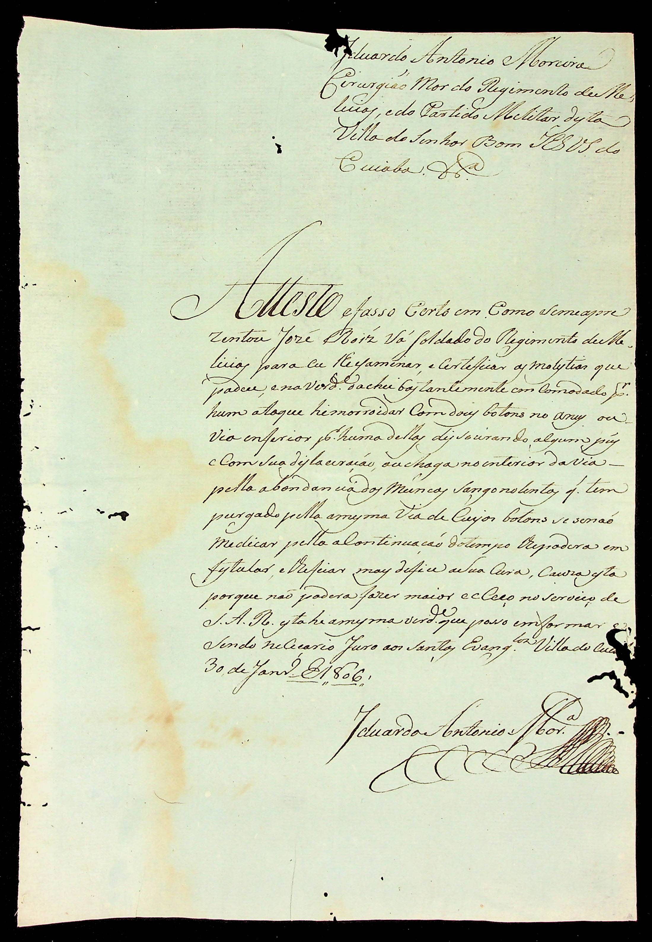 ATESTADO expedido pelo Cirurgião-mor do Regimento de Milícias Eduardo Antônio Moreira sobre enfermidadedo Soldado José Rodrigues [Sá].