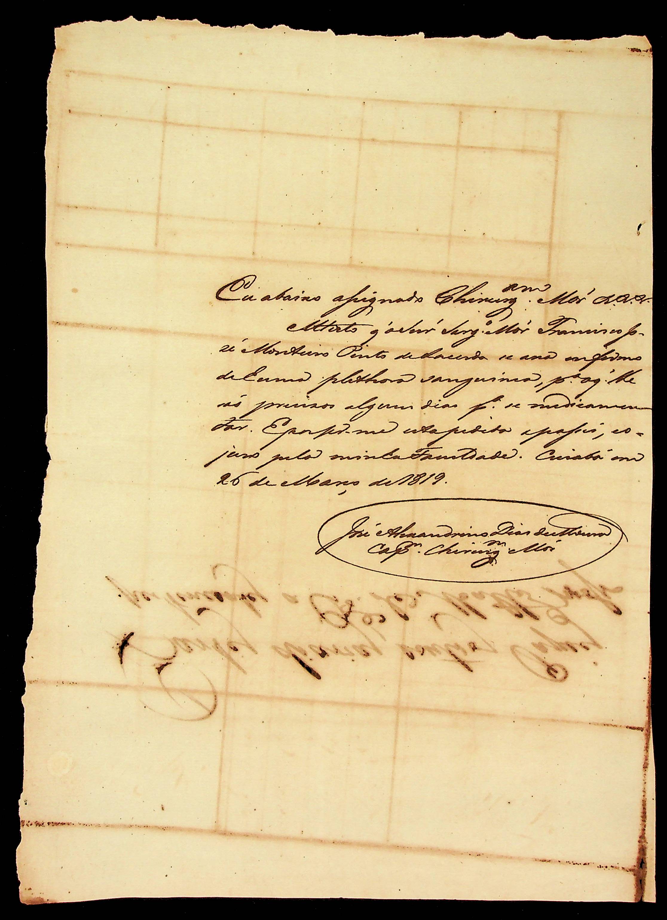 ATESTADO expedido pelo Cirurgião-mor José Alexandrino Dias de Moura sobre Sargento-mor Francisco José Monteiro Pinto.