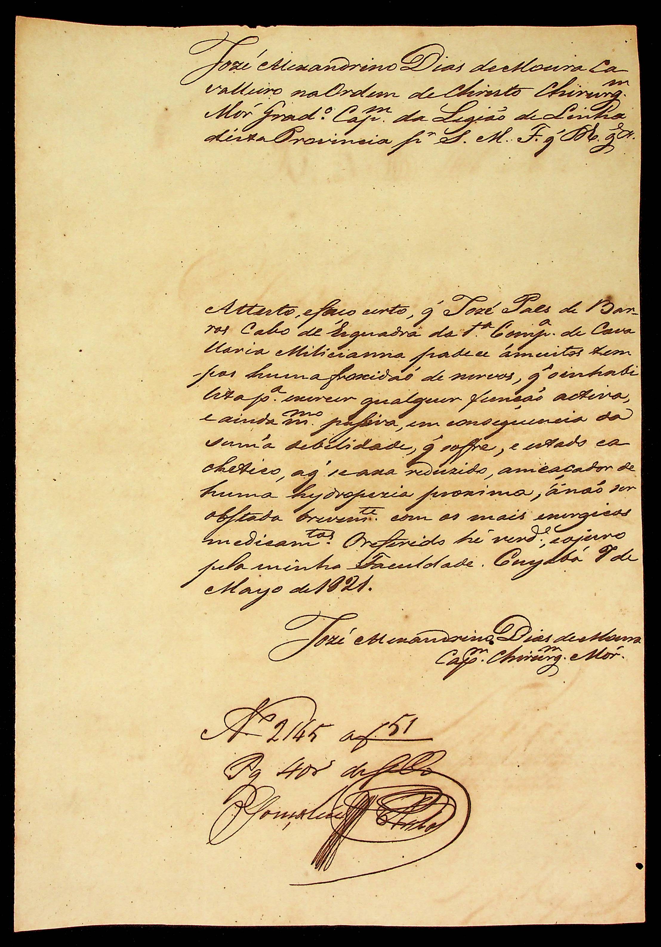 ATESTADO expedido pelo Cirurgião-mor José Alexandrino Dias de Moura sobre a enfermidade do Cabo deEsquadra José Paes de Barros.
