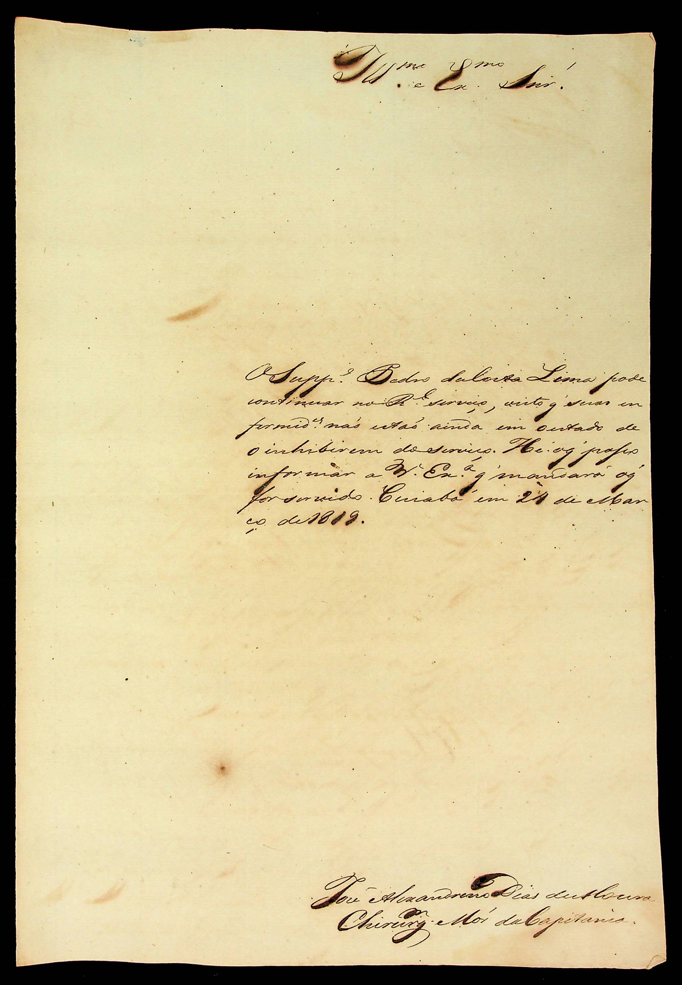 CARTA do Cirurgião-mor José Alexandrino Dias de Moura ao [Governador e Capitão-General da Capitania de Mato Grosso Francisco de Paula Maggessi Tavares de Carvalho].