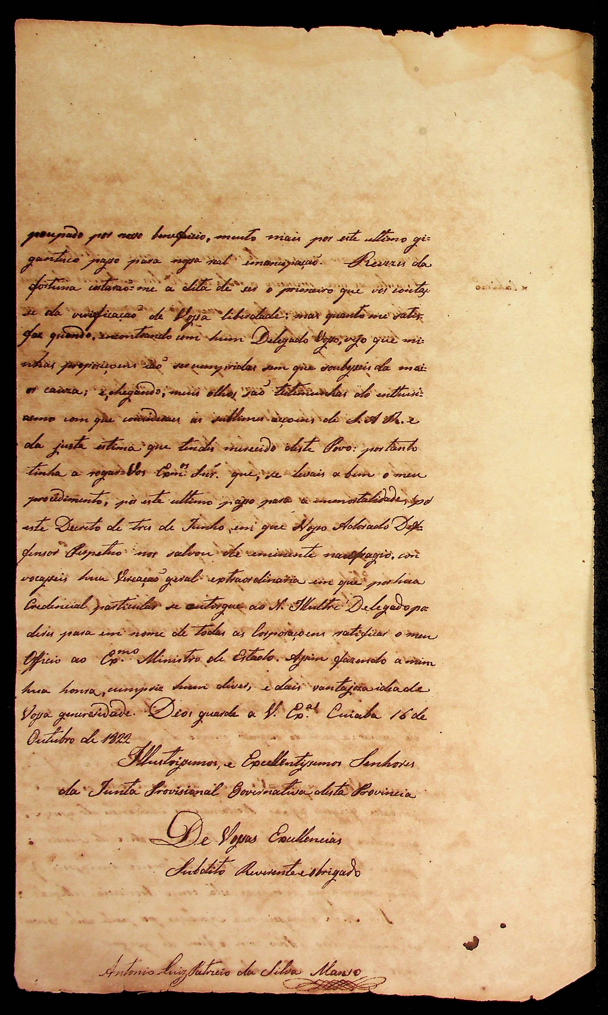 CARTA do [Cirurgião] Antônio Luiz Patrício da Silva à Junta Governativa Provisória.
