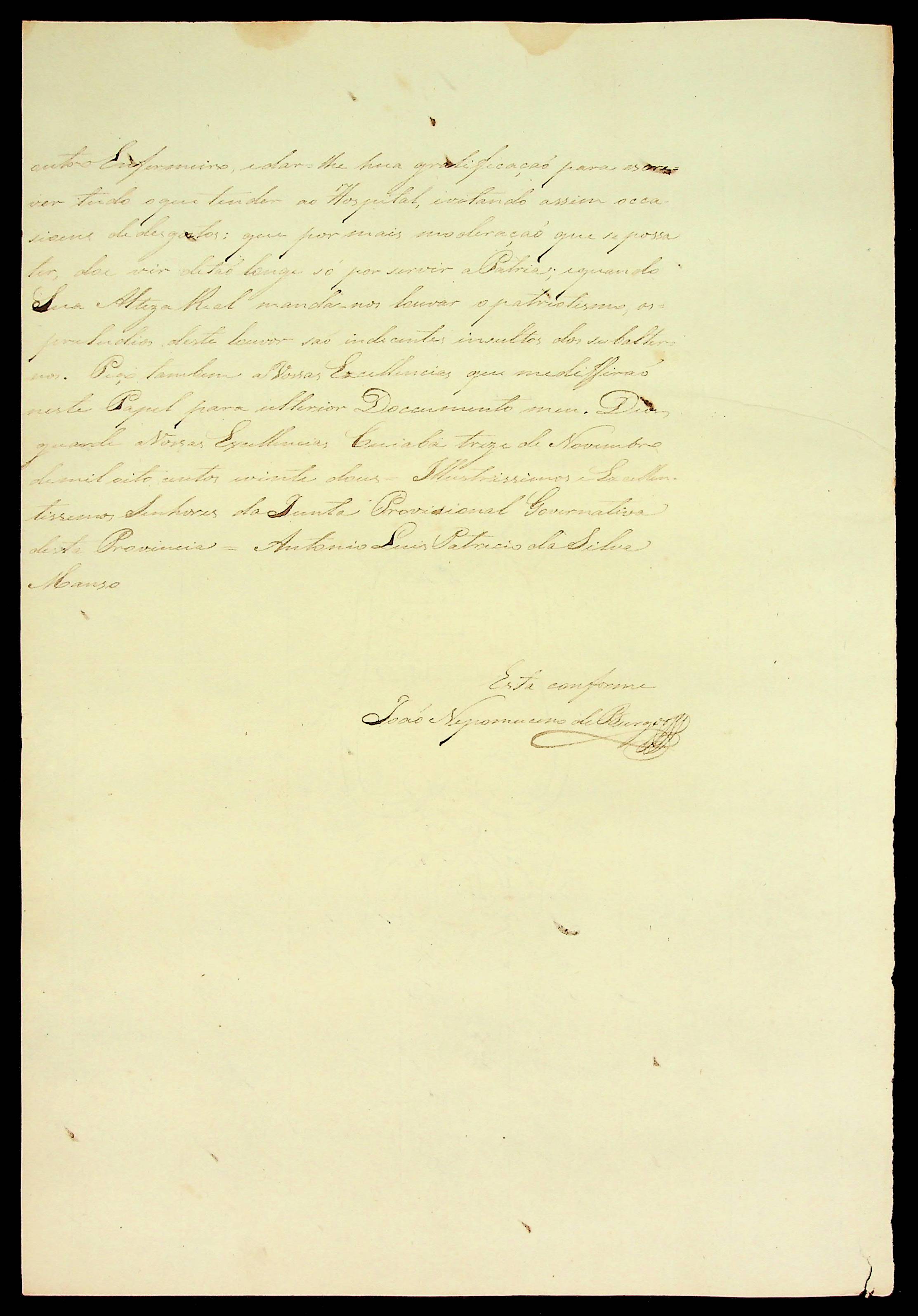 CARTA do [Cirurgião] Antônio Luís Patrício à Junta Governativa Provisória de Cuiabá.