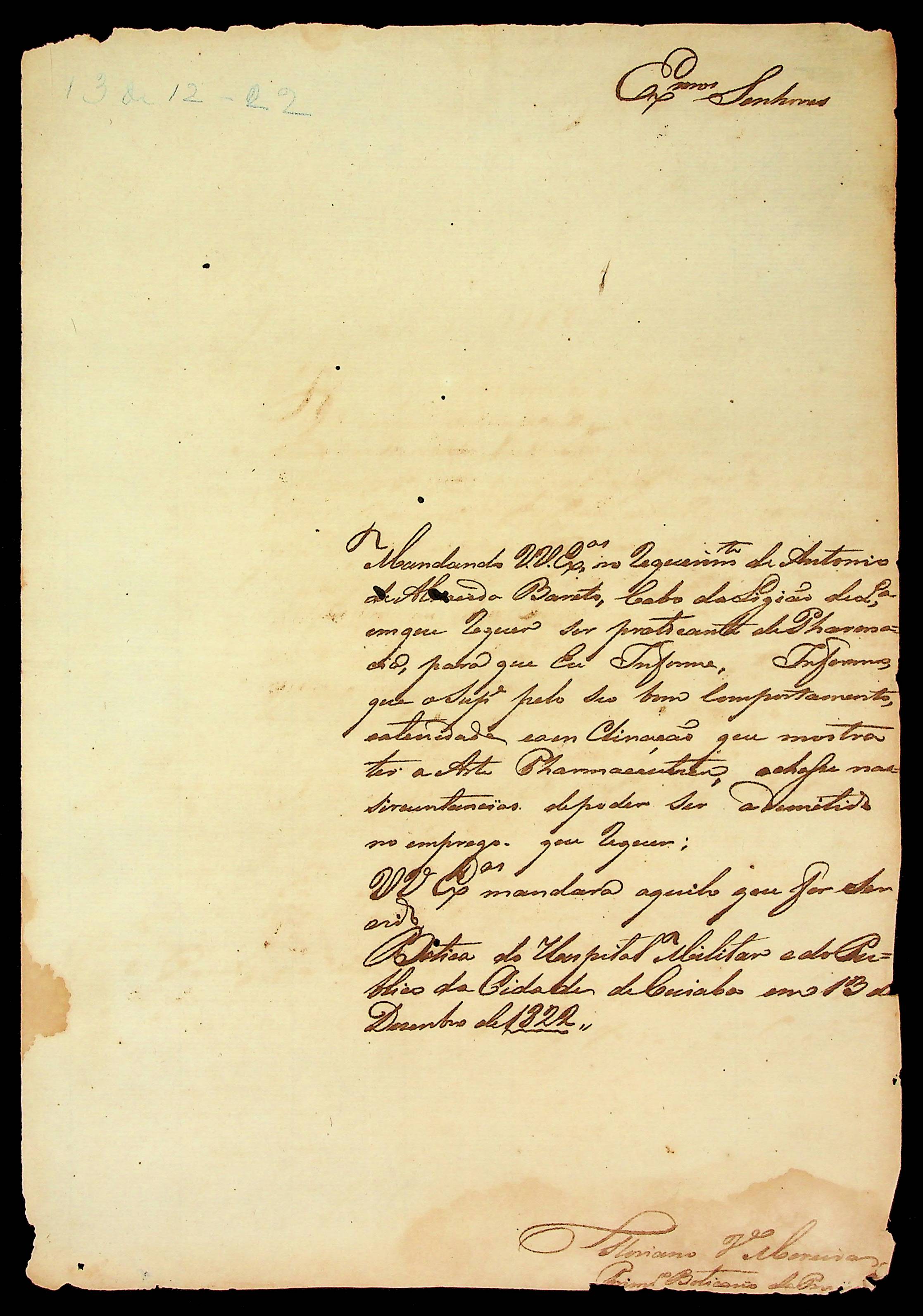 CARTA do Primeiro Boticário Floriano [José] Moreira à [Primeira Junta Governativa Provisória].