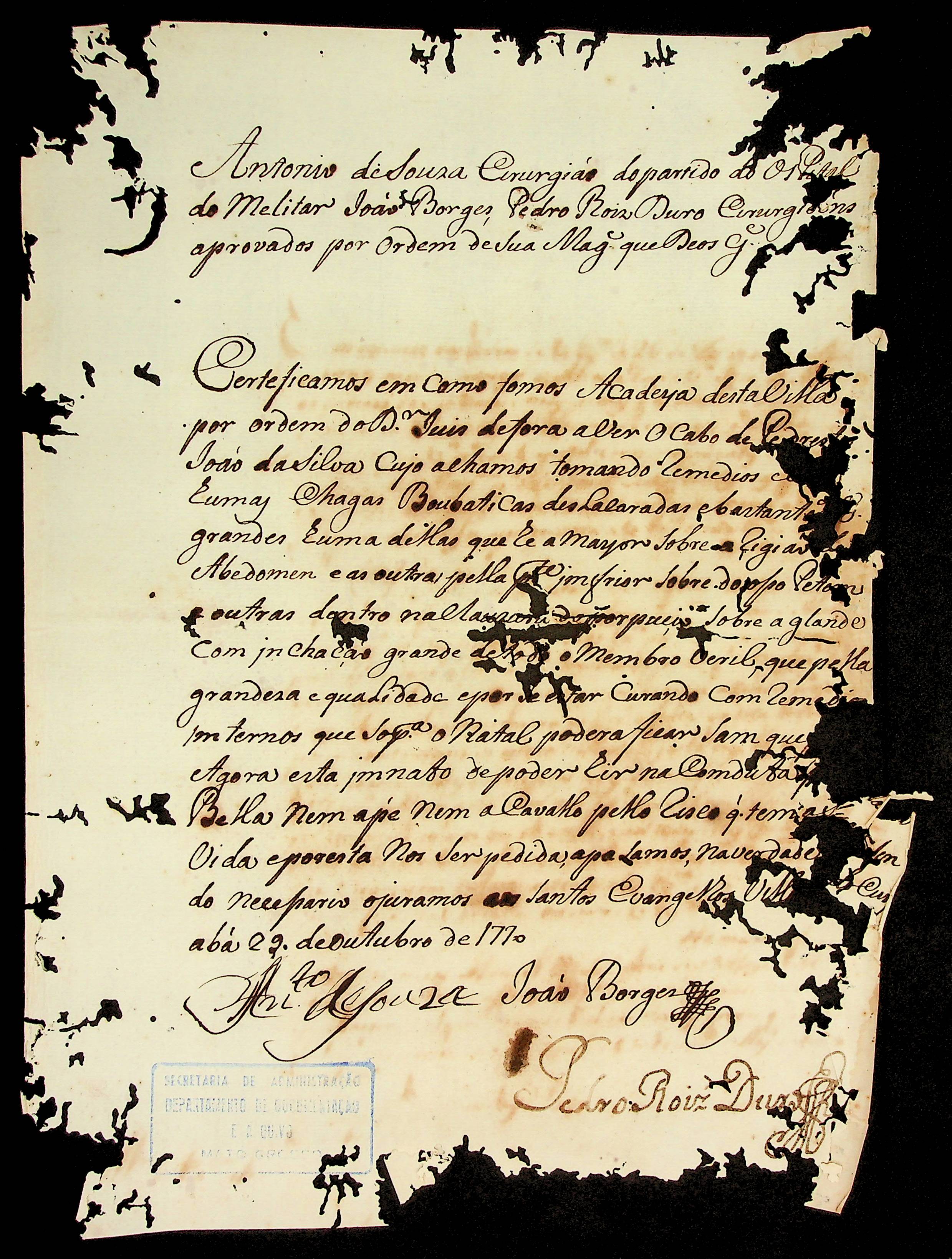 CERTIDÃO assinada pelos cirurgiões do partido do Hospital Militar Antônio de Souza, do Partido Militar, João Borges, e Pedro Rodrigues Duros, informando que o Cabo de Pedestre João da Silva encontra-se enfermo.