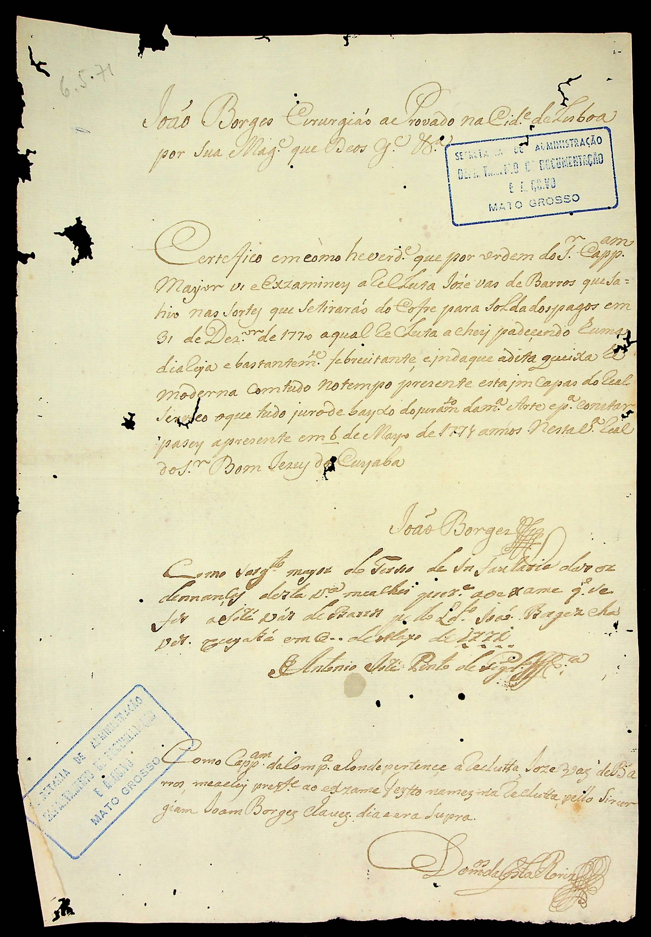 CERTIDÃO assinada pelo Cirurgião João Borges relatando o resultado dos exames do recruta José Vaz de Barros.