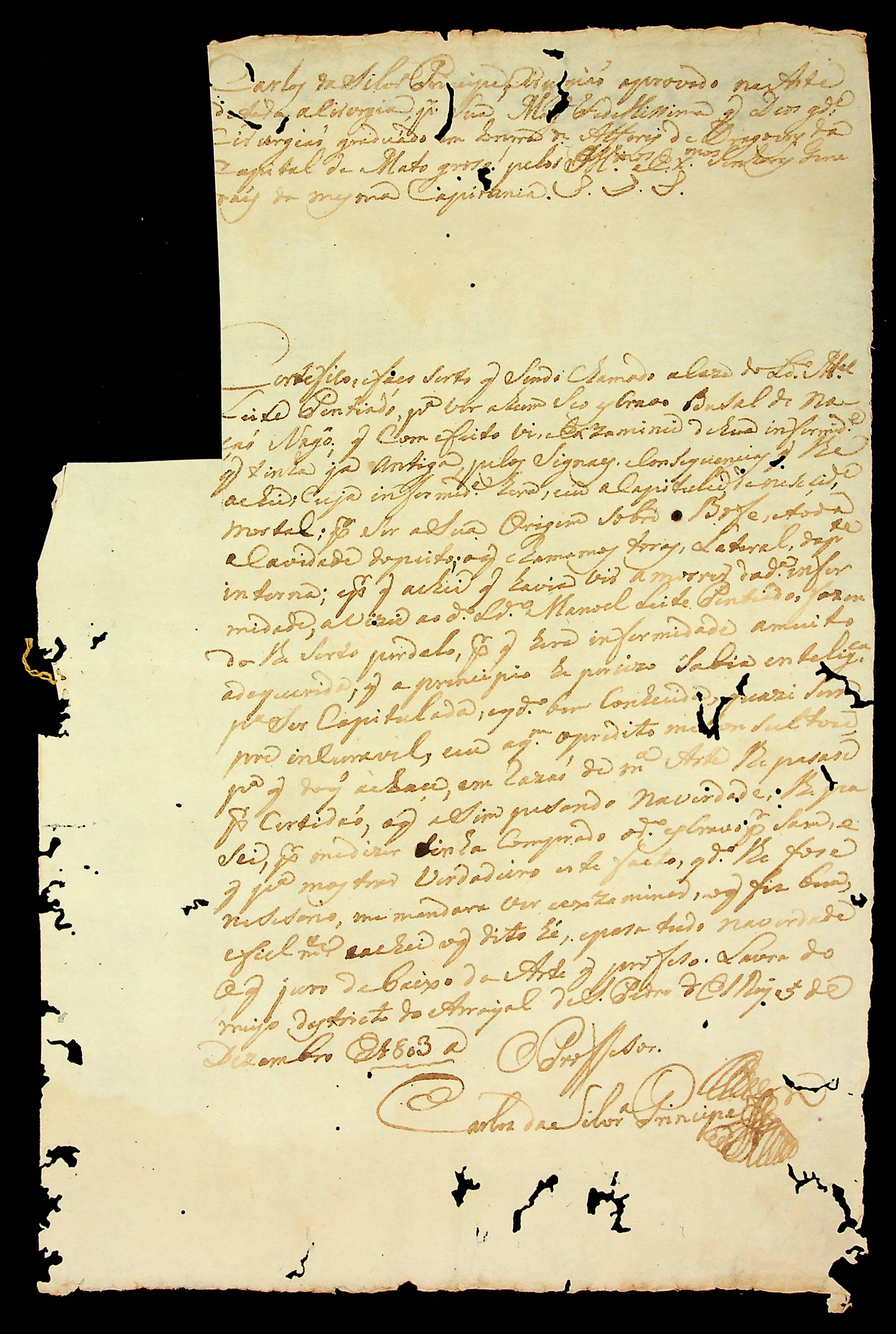 CERTIDÃO expedido pelo Cirurgião Carlos da Silveira Príncipe sobre a moléstia de um escravo do Soldado Manoel Leite Penteado.
